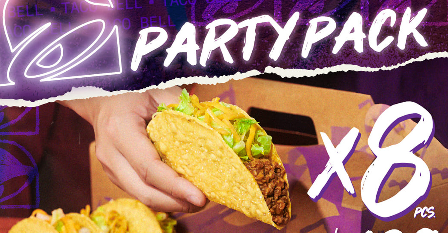 - ชุด Party Pack B ประกอบไปด้วยทาโก้ 8 ชิ้น 4 รสชาติ ประกอบด้วย ทาโก้ (Tacos) ทาโก้ต้นตำรับ (Tacos Supreme) ทาโก้ชีส 2 ชั้น (Double Decker Tacos) และทาโก้ไก่กรอบไม่มีกระดูก (Crispy Chicken Tacos) แชร์ความอร่อยที่หลากหลายสุดคุ้มกับกลุ่มเพื่อนซี้ ในราคาเริ่มต้นเพียง 599 บาท