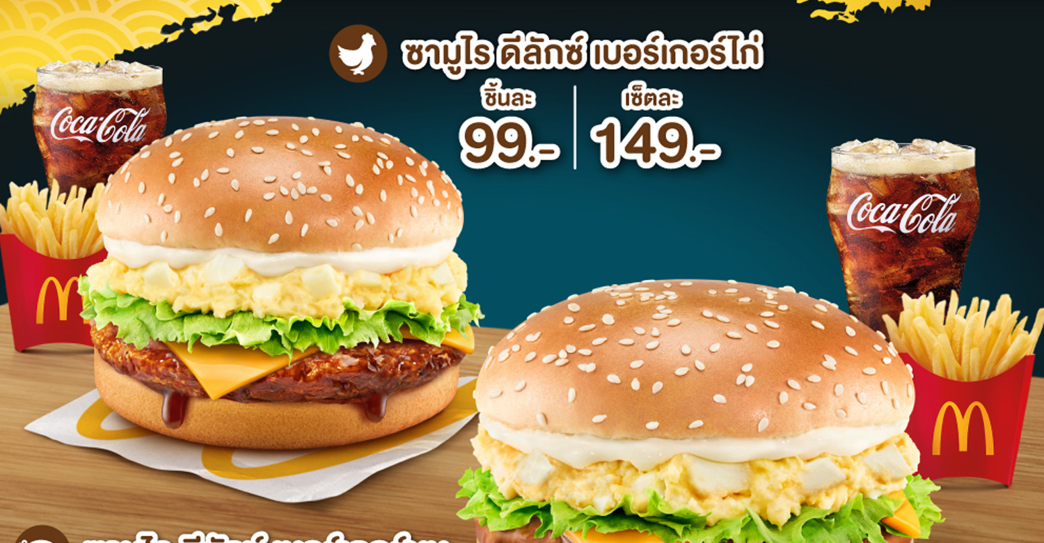 แมคโดนัลด์ ต่อยอดความอร่อยจากเมนูฮิตตลอดกาล ‘ซามูไรเบอร์เกอร์’ ภายใต้คอนเซ็ปต์ ‘ปลุกสปิริตความเป็นซามูไรในตัวคุณ เพื่อทำทุกวันให้ดีขึ้น’ เหมือนกับซามูไรเบอร์เกอร์ ที่ยังคงพัฒนาความอร่อยอย่างไม่หยุดยั้ง พิเศษ! ด้วยเมนูใหม่ที่อร่อยฟินกว่าเดิมกับ ‘ซามูไร ดีลักซ์ เบอร์เกอร์’ ขั้นกว่าของความอร่อยที่จัดเต็มรสชาติอันเป็นเอกลักษณ์ของซอสซามูไรสุดชุ่มฉ่ำสูตรเฉพาะของแมคโดนัลด์ ฟินยิ่งขึ้นกับ Egg Salad สไตล์ญี่ปุ่น ไข่เต็มชิ้นคลุกเคล้ากับน้ำสลัดรสกลมกล่อม พร้อมเชดด้าชีสสุดลงตัว และยังเลือกอร่อยได้ทั้งหมูและไก่ ในราคาเริ่มต้นเพียงชิ้นละ 99 บาทเท่านั้นหรืออิ่มคุ้มเป็นชุดพร้อมเฟรนช์ฟรายส์ขนาดกลางและโค้ก 16 ออนซ์ เริ่มต้นเพียงชุดละ 149 บาท