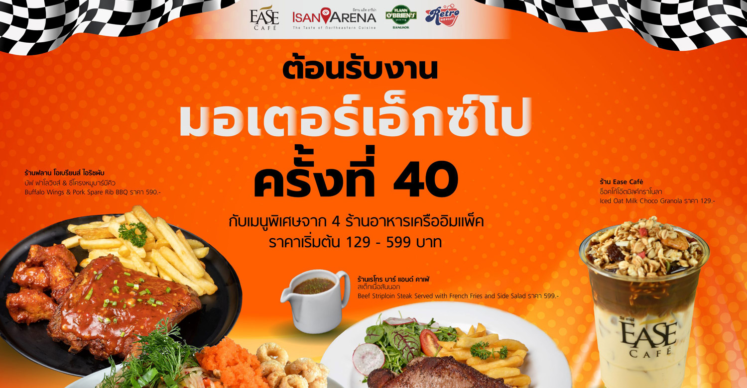 เดินชมงานเพลินๆ แล้ว อย่าลืมแวะเติมความอร่อยกับหลากหลายเมนูนานาชาติโดยฝีมือเชฟคุณภาพที่ 4 ร้านอาหารในเครืออิมแพ็ค ได้แก่ ร้านฟลาน โอเบรียนส์ ไอริชผับ ร้านเรโทร บาร์ แอนด์ คาเฟ่ ร้านอีสาน แอ็ท อารีน่า และร้านอีสคาเฟ่ ในราคาเริ่มต้น 129 – 599 บาท (ราคายังไม่รวมค่าบริการ 10% และภาษีมูลค่าเพิ่ม 7%) พร้อมให้บริการตั้งแต่วันที่ 28 พฤศจิกายน ศกนี้ – จนกว่าจะแจ้งการเปลี่ยนแปลง