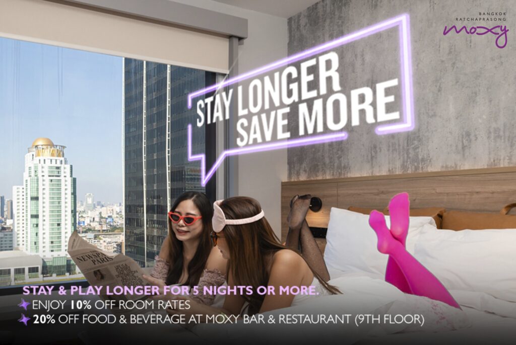 นอกจากนี้ แขกผู้เข้าพักสามารถรับความคุ้มค่ายิ่งขึ้นกับโปรโมชั่น Stay Longer Save More โดยการเข้าพักตั้งแต่ 5 คืนขึ้นไปจะได้รับส่วนลดค่าห้องพัก 10% และรับส่วนลดค่าอาหารและเครื่องดื่ม 20% ที่ม็อกซี่ บาร์ แอนด์ เรสเตอรองต์ (ชั้น 9) สำหรับผู้เข้าพักระยะยาว โรงแรมยังมีราคาเฉพาะสำหรับการเข้าพักตั้งแต่ 12 คืนขึ้นไป พร้อมเงื่อนไขยกเลิกฟรีภายใน 14 วันก่อนเข้าพัก เหมาะสำหรับการทำงานระยะยาว การพักผ่อนแบบยืดหยุ่น หรือผู้ที่ต้องการความคล่องตัวในทำเลใจกลางเมือง สามารถจองได้ที่ https://www.marriott.com/offers/length-of-stay-offer-off-178656/bkkox-moxy-bangkok-ratchaprasong?propertycode=bkkox&cid=PSO_GLB0006T8V_GLE000GFLG_GLF0013R9X