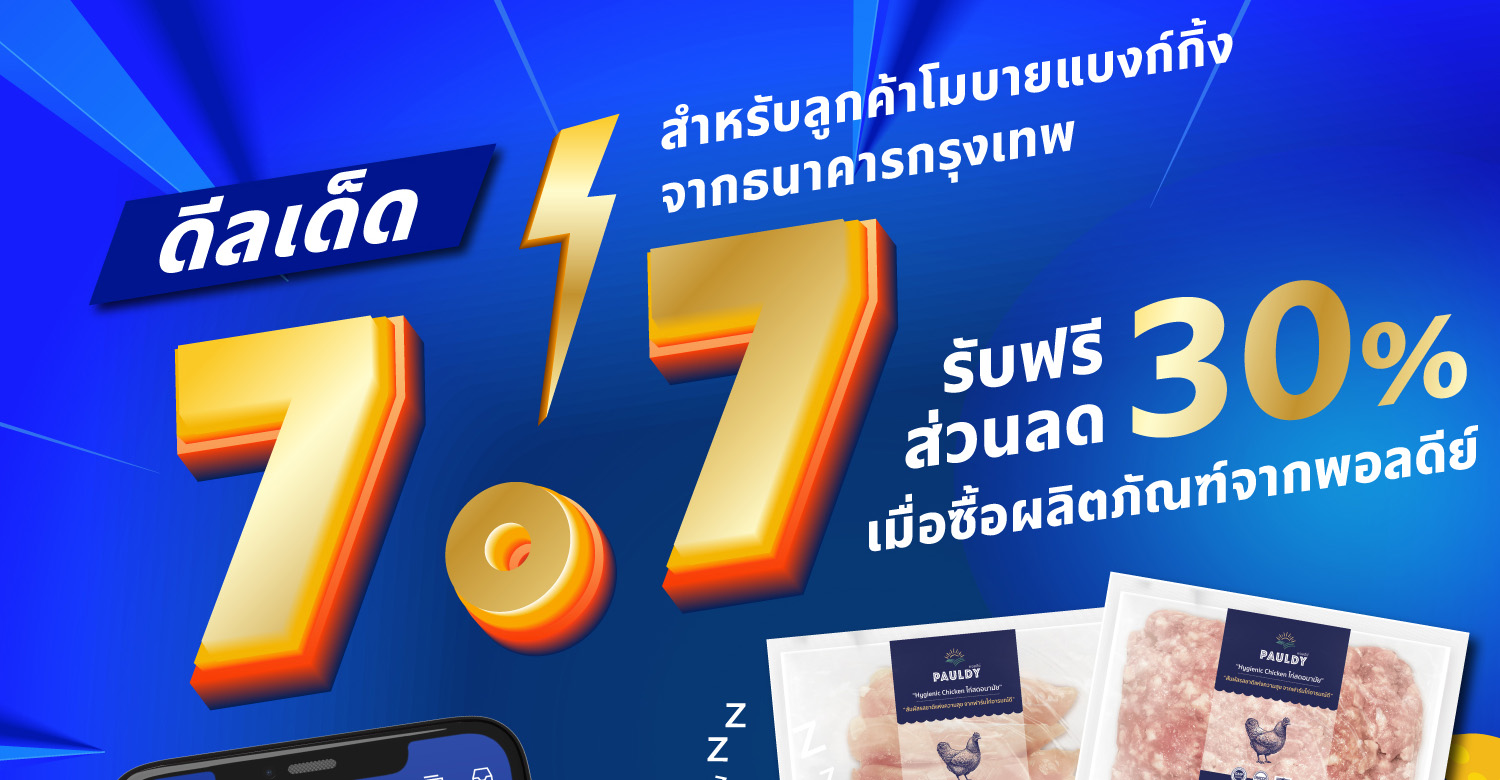 พ่อบ้านแม่บ้านลูกค้าแบงค์กรุงเทพเตรียมเฮ! พอลดีย์ ร่วมกับธนาคารกรุงเทพ จัดมหกรรมดีลเด็ด 7.7 มอบสิทธิพิเศษสำหรับลูกค้าโมบายแบงก์กิ้ง จากธนาคารกรุงเทพ รับฟรีส่วนลด 30% เมื่อซื้อผลิตภัณฑ์จากพอลดีย์ (Pauldy) อาทิ ไก่สดอนามัย ไก่พร้อมปรุงประเภทต่างๆ ผ่านช่องทาง Line ID : @pauldy พิเศษ 200 ท่านแรกที่กดรับสิทธิ รับส่วนลดพิเศษ มูลค่า 200 บาท *เงื่อนไขตามที่โครงการกำหนด ตั้งแต่วันที่ 7 ก.ค. – 7 ต.ค. 65 นี้เท่านั้น