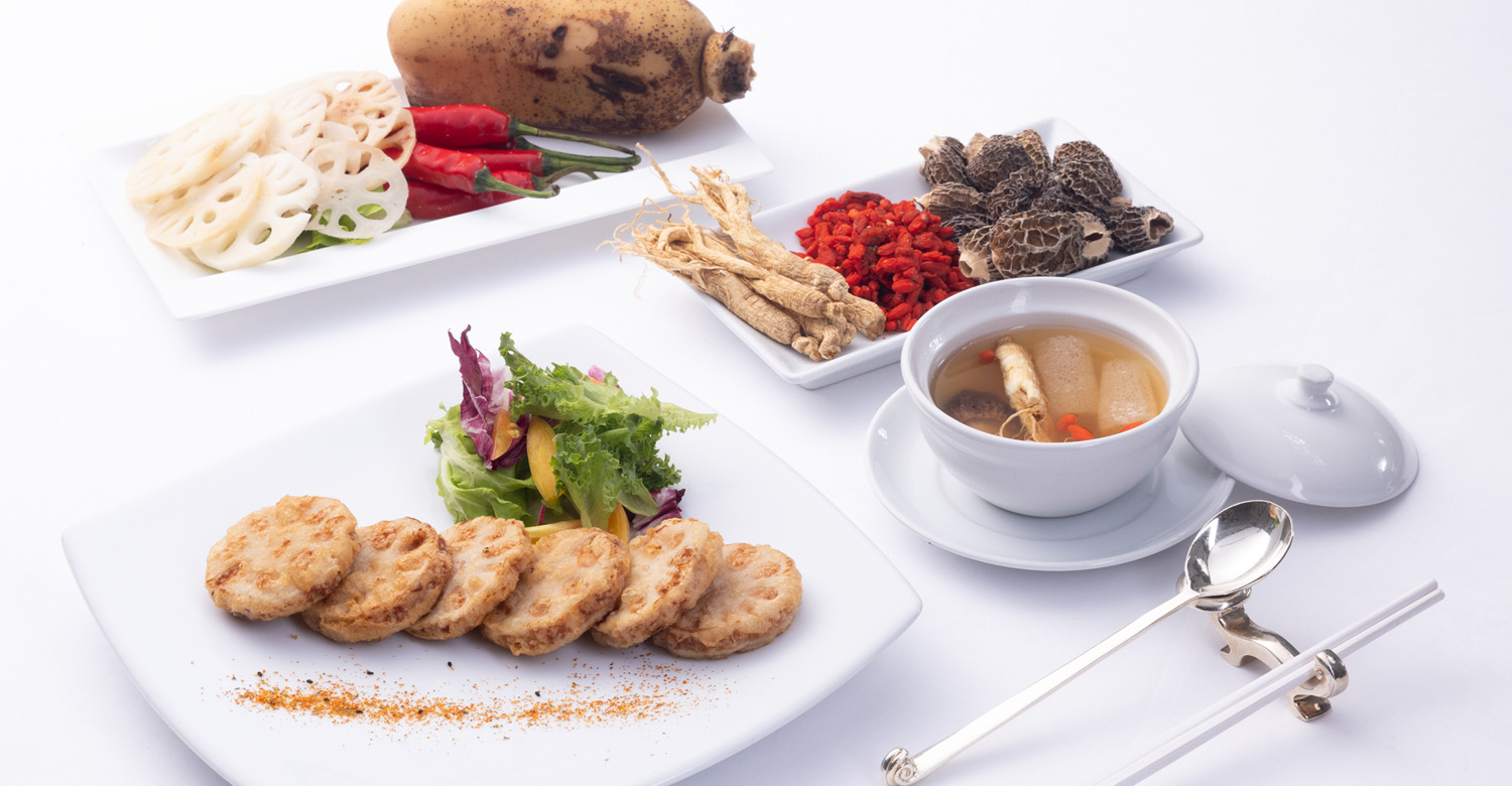 เริ่มต้นด้วย ซุปโสมตุ๋นรสชาติกลมกล่อมที่มีส่วนประกอบของเยื่อไผ่ (Bamboo Pith) และเห็ดมอเรล (Morel Mushroom) ตามด้วยกลอยจีน (Chinese Yam) และหัวต้นลิลลี่ (Fresh Lily Bulb) ผัดซอสน้ำผึ้งที่มีกลิ่นหอมละมุนของดอกหอมหมื่นลี้ (Osmanthus Honey Sauce) นอกจากนี้ยังมี เห็ดนางรมหลวงผัดพริกและผักดองแห้ง รากบัวทอดสอดไส้เนื้อโปรตีนเกษตร และถั่วลูกไก่ผัดดอกกะหล่ำในซอสกังเป่า (Kung Pao)