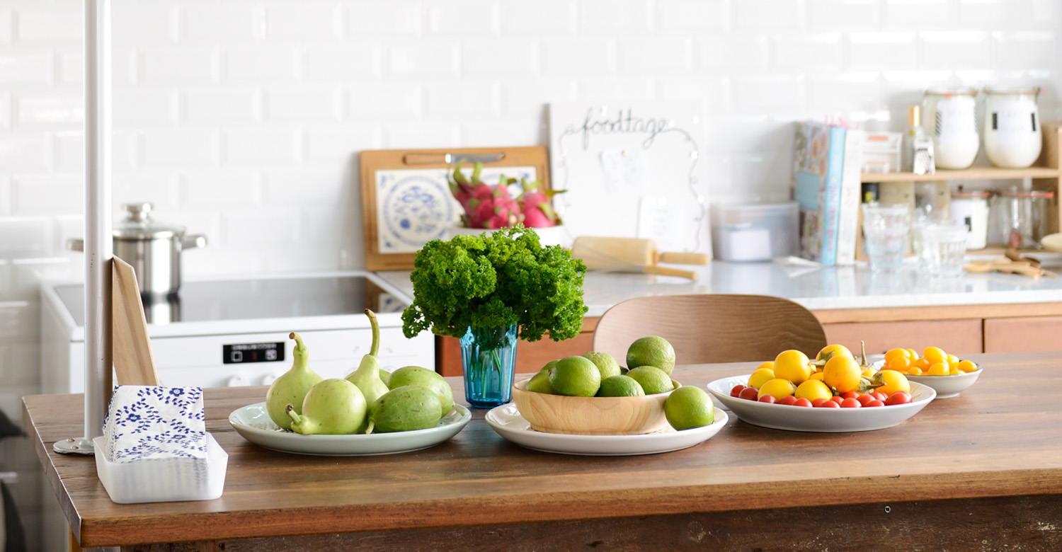 5. ผักและผลไม้สด หรือแม้แต่ของสะสมที่ชอบก็นำมาวางเป็นพร็อพบนเคาน์เตอร์ครัว สร้างสีสันได้ดีทีเดียวล่ะ