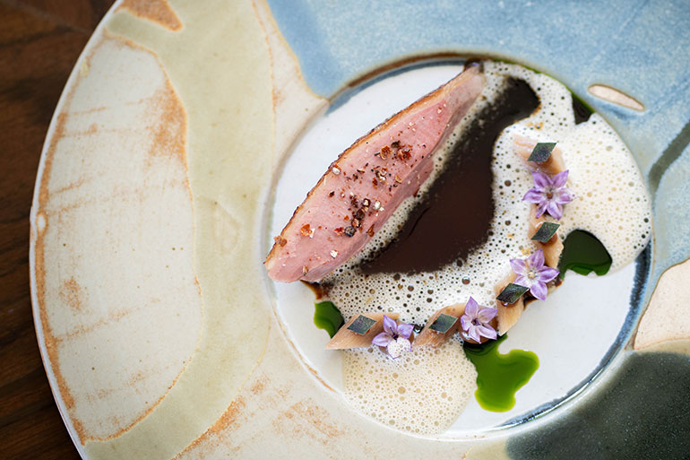 จากนั้นเป็นคอร์สที่สี่อย่าง Squid & Blue Cheese เสิร์ฟพร้อม Grange Shiraz 2001 ซึ่งโดดเด่นด้วยรสชาติเข้มข้นของตัวไวน์ กลิ่นเฉพาะจากการหมักในถังและไม้อเมริกันโอ๊กใหม่ 18 เดือนแสดงตัวอย่างสง่างาม มีกลิ่นรากซาสพาริลลา ครีมโซดา โคล่า รากเบียร์ รวมถึงกลิ่นชะเอมดำและซีอิ๊ว แทนนินเข้มข้น เสริมโครงสร้างที่แข็งแกร่ง ก่อนจะไปที่เมนคอร์สคือ Aged Duck & Tamarind เมนูซิกเนเจอร์ของ PRU ที่ปรุงด้วยโป๊ยกั๊กและพริกไทยดำ เสิร์ฟคู่กับ Grange Shiraz 2018 ไวน์รสชาติเยี่ยมที่ได้ถึง 100 คะแนนเต็มจาก Robert Parker นักวิจารณ์ไวน์ชื่อดังของโลก เด่นชัดด้วยอโรม่าของแบล็กเบอร์รี่สุกเข้มข้น/แบล็กเคอร์แรนต์เข้มข้น แฝงด้วยเครื่องเทศ สัมผัสในปากแน่นทั่วเต็มคำ แทนนินหนักแน่นแต่กลมกลืน มีความสมดุลให้โครงสร้างไวน์ที่แข็งแกร่ง รสชาติแบบ “Black Forest Cake” ปิดท้ายค่ำคืนด้วยของหวานตามฤดูกาลอย่าง Marian Plum & Phuket Pineapple ที่นำผลไม้มาปรุงด้วยเทคนิคพิเศษเพื่อเติมความสดชื่น ให้ค่ำคืนนี้จบลงอย่างน่าประทับใจ