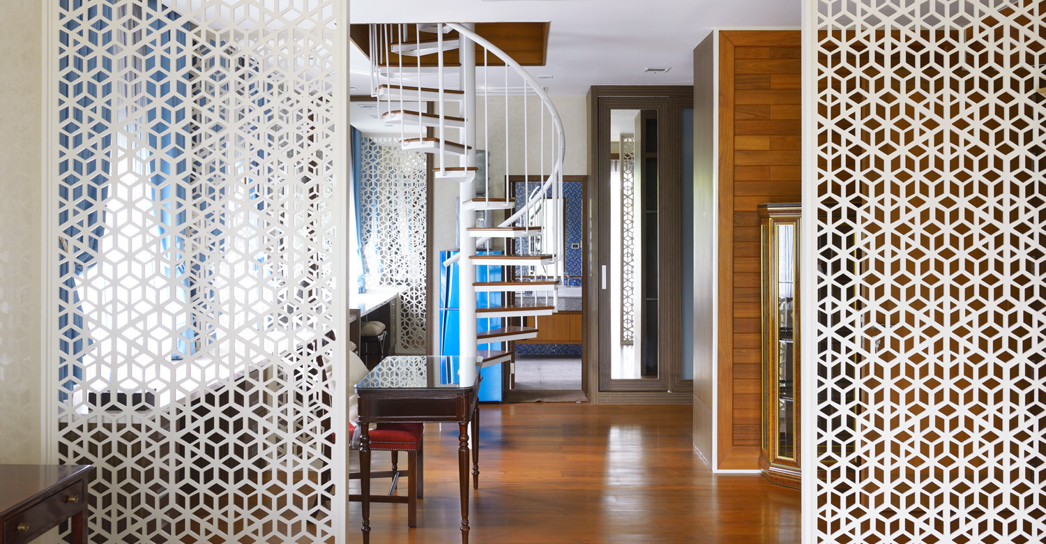 อาจเลือกใช้ราวจับสเตนเลส เนื่องจากเป็นโครงสร้างที่ดูบางเบา ทำให้ภาพรวมของดีไซน์ไม่ทึบตัน ส่วนลูกนอนใช้วัสดุไม้ดีไซน์ความหนาบางแตกต่างกันเพื่อให้เกิดมิติ เพียงเท่านี้ก็ไม่บดบังความสวยงามส่วนอื่นๆ ภายในบ้าน