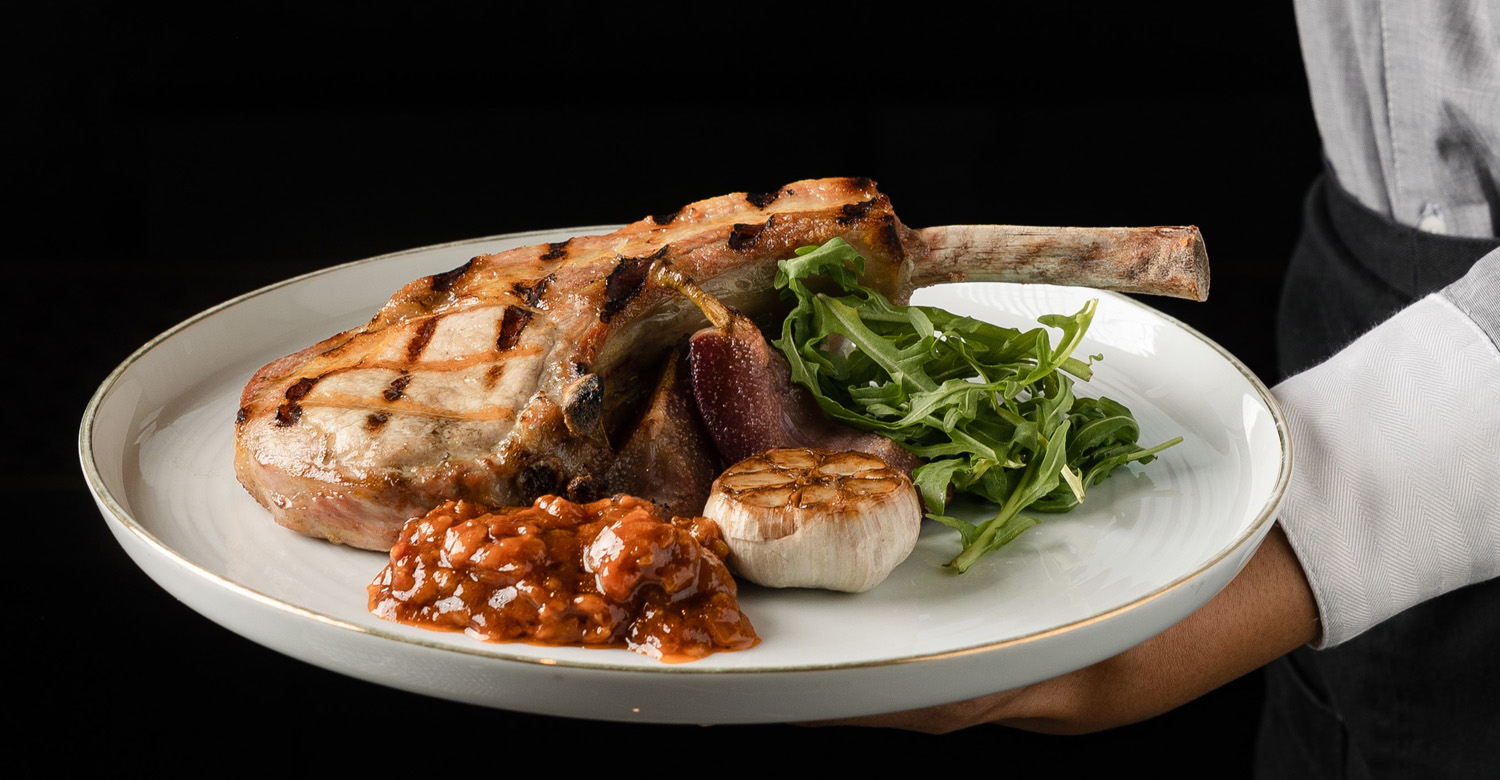 เชฟมากฝีมือได้คัดสรรเนื้อหมูคุณภาพสูง คัดสรรจากฟาร์มท้องถิ่นที่มีความรับผิดชอบในจังหวัดราชบุรี และใช้การบ่มแห้งถึง 14 วัน เพื่อเพิ่มรสชาติที่นุ่มนวลและชุ่มฉ่ำ นำมาย่างบนเตาถ่านร้อนๆ เสิร์ฟพร้อมกับลูกแพร์ในไวน์แดง กระเทียมย่าง และแยมเบคอน ให้รสสัมผัสถึงความสมดุลของรสชาติเค็มและหวาน
