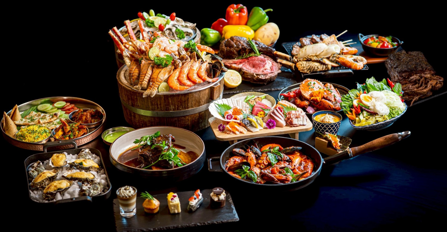 เริ่มต้นด้วยซีฟู้ดออนไอซ์สุดอลังการ ไม่ว่าจะเป็นปูอลาสก้าคิงแครบ กุ้งแม่น้ำ ล็อบสเตอร์ กั้ง และหอยนานาชนิด ทั้ง หอยนางรมฟินเดอแคลร์ (Fine de Claire) หอยนางรมนอร์มังดี (Normandy) และหอยนางรมเกาหลี พร้อมด้วยสเตชั่นอาหารญี่ปุ่นสดใหม่ ที่เสิร์ฟซูชิและซาชิมิเกรดพรีเมียม ทั้งแซลมอน ทูน่า ฮามาจิ และวากิว นิกิริ เพลิดเพลินกับมุมเนื้ออบและกริลล์แบบสดใหม่ ที่นำเสนอเนื้อพรีเมียมอย่าง เนื้อไพร์มริบออสเตรเลีย เนื้อวากิวบริสเก็ต รมควันสไตล์เท็กซัส ขาแกะอบ แซลมอนนอร์เวย์ และหอยเชลล์อเมริกาย่างเสิร์ฟร้อน นอกจากนี้ยังมีมุม BBQ ปิ้งย่างสดใหม่ ทั้งกุ้งแม่น้ำ หมึก เนื้อวัว และซี่โครงแกะ หลากหลายเมนูเด่น นานาชาติ ที่มาเติมเต็มความอร่อย ทั้งซุปล็อบสเตอร์บิสก์ หอยนางรมร็อคกีเฟลเลอร์ (Oysters Rockefeller) ปูผัดซอสพริกสไตล์สิงคโปร์ มัสมั่นแก้มวัว และก๋วยเตี๋ยวเนื้อวากิวรสเข้มข้น