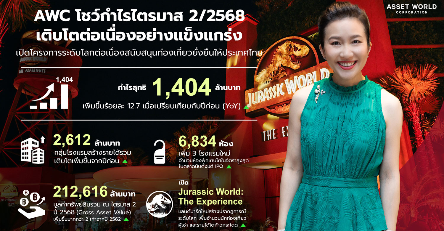 นางวัลลภา ไตรโสรัส ประธานเจ้าหน้าที่บริหารและกรรมการผู้จัดการใหญ่ แอสเสท เวิรด์ คอร์ปอเรชั่น หรือ AWC เผยผลประกอบการไตรมาส 2 ปี 2568 สร้างการเติบโตอย่างแข็งแกร่ง โดยมีรายได้รวมอยู่ที่ 5,211 ล้านบาท เติบโตขึ้นร้อยละ 7.7 (YoY) และมีกำไรจากการดำเนินงาน (EBITDA) อยู่ที่ 2,723 ล้านบาท เพิ่มขึ้นร้อยละ 9.3 (YoY) ส่งผลให้บริษัทมีกำไรสุทธิ 1,404 ล้านบาท เพิ่มขึ้นร้อยละ 12.7 (YoY) พร้อมเดินหน้าขยายพอร์ตโฟลิโอคุณภาพเพื่อเสริมศักยภาพการท่องเที่ยวยั่งยืนของประเทศ อาทิ โรงแรม มีเลีย พัทยา โฮเต็ล ประเทศไทย โรงแรม พัทยา แมริออท รีสอร์ต แอนด์ สปา โรงแรม สวิสโซเทล กรุงเทพ รัชดา (เตรียมรีแบรนด์เป็นโรงแรม เจดับบลิว แมริออท แบงก์ค็อก รัชดาภิเษก)