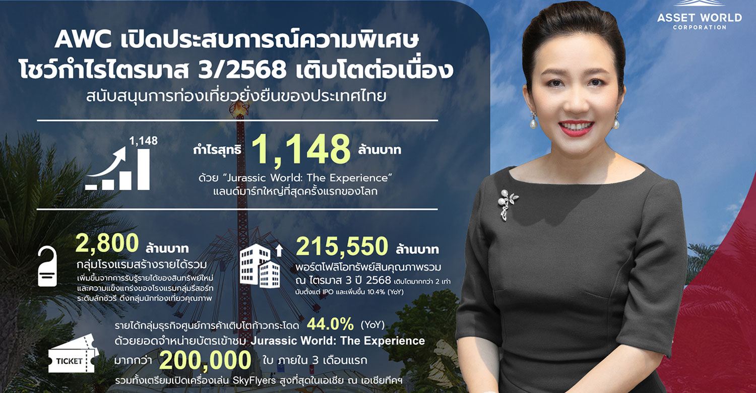 ด้วยความสำเร็จจากการสร้างประสบการณ์ความสุขในรูปแบบพิเศษครั้งแรกของโลก “Jurassic World:The Experience” ที่โครงการเอเชียทีค เดอะ ริเวอร์ฟร้อนท์ เดสติเนชั่น แลนด์มาร์กใหม่ระดับโลกที่สร้างประสบการณ์เสมือนจริงแบบอิมเมอร์ซีฟ พร้อม Hatch Dome โลกแห่งการเรียนรู้ยุคใหม่ด้านความยั่งยืนให้แก่เยาวชน โดยมียอดจำหน่ายบัตรเข้าชมมากกว่า 200,000 ใบ ในช่วง 3 เดือนแรกหลังเปิดให้บริการ หนุนรายได้ของกลุ่มคอมเมอร์เชียลเติบโตโดดเด่น ขณะที่กลุ่มโรงแรมและการบริการ ได้รับปัจจัยสนับสนุนจากการเติบโตของโรงแรมในกลุ่มรีสอร์ท ระดับลักชัวรี ด้วยความร่วมมือกับพันธมิตรระดับโลกในการดึงดูดฐานลูกค้าคุณภาพกว่า 710 ล้านคนจากทั่วโลก ด้านกลุ่มอาคารสำนักงานเติบโตจากกลยุทธ์การตลาดเชิงรุกด้วยแนวคิด AWC’s Lifestyle Destination ที่สร้างมูลค่าเพิ่มและขยายฐานผู้เช่าอย่างต่อเนื่อง