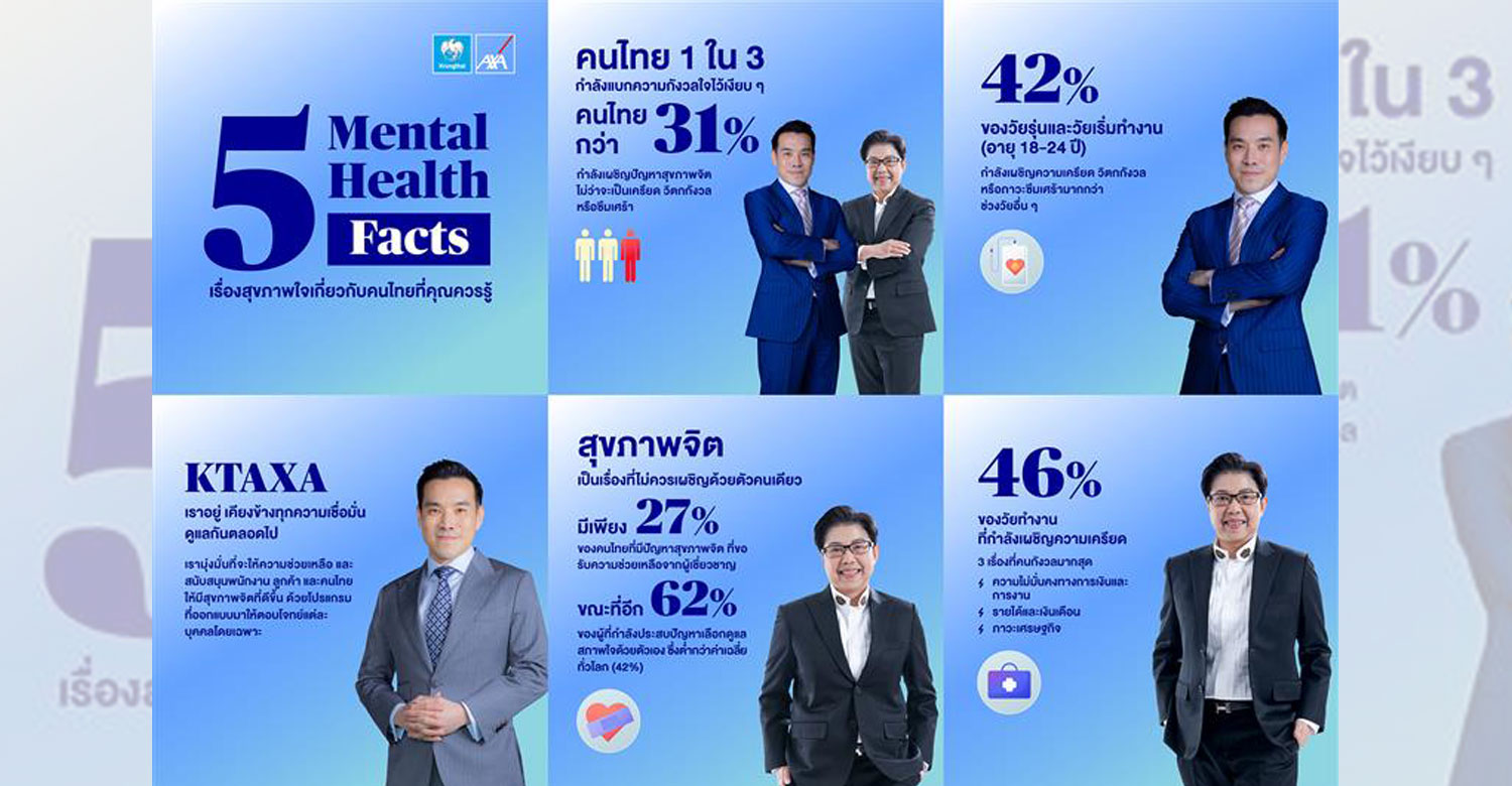 บมจ.กรุงไทย-แอกซ่า ประกันชีวิต ร่วมกับกลุ่มแอกซ่า จัดทำผลวิจัย AXA Mind Health 2025 เพื่อสำรวจสุขภาพจิตของคนไทย และคนทั่วโลก เพื่อวิเคราะห์ว่า กลุ่มวัยใดที่กำลังเผชิญกับปัญหาทางใจมากที่สุด พร้อมวัดระดับสุขภาพใจด้วยตัวเอง โดยประเด็นสุขภาพจิตยังคงเป็นปัญหาระดับโลกและเป็นประเด็นที่กลุ่มแอกซ่าให้ความสำคัญมาโดยตลอด โดยทุกๆ ปี กลุ่มแอกซ่าจะร่วมมือกับบริษัทวิจัยมาตรฐานโลก Ipsos ในการติดตามระดับสุขภาพจิตของคนทั่วโลก โดยล่าสุดมีการสำรวจประชากรกว่า 17,000 คน จาก 16 ประเทศ โดยใช้ AXA Mind Health Index เป็นตัววัดระดับสุขภาพจิต และแบ่งสถานะทางจิตใจของผู้ตอบแบบสอบถามออกเป็น 4 สถานะ ได้แก่ “Flourishing” (เบิกบานใจ) “Getting by” (เรื่อยๆ) “Languishing” (เหนื่อยหน่าย) และ “Struggling” (กำลังมีปัญหา)