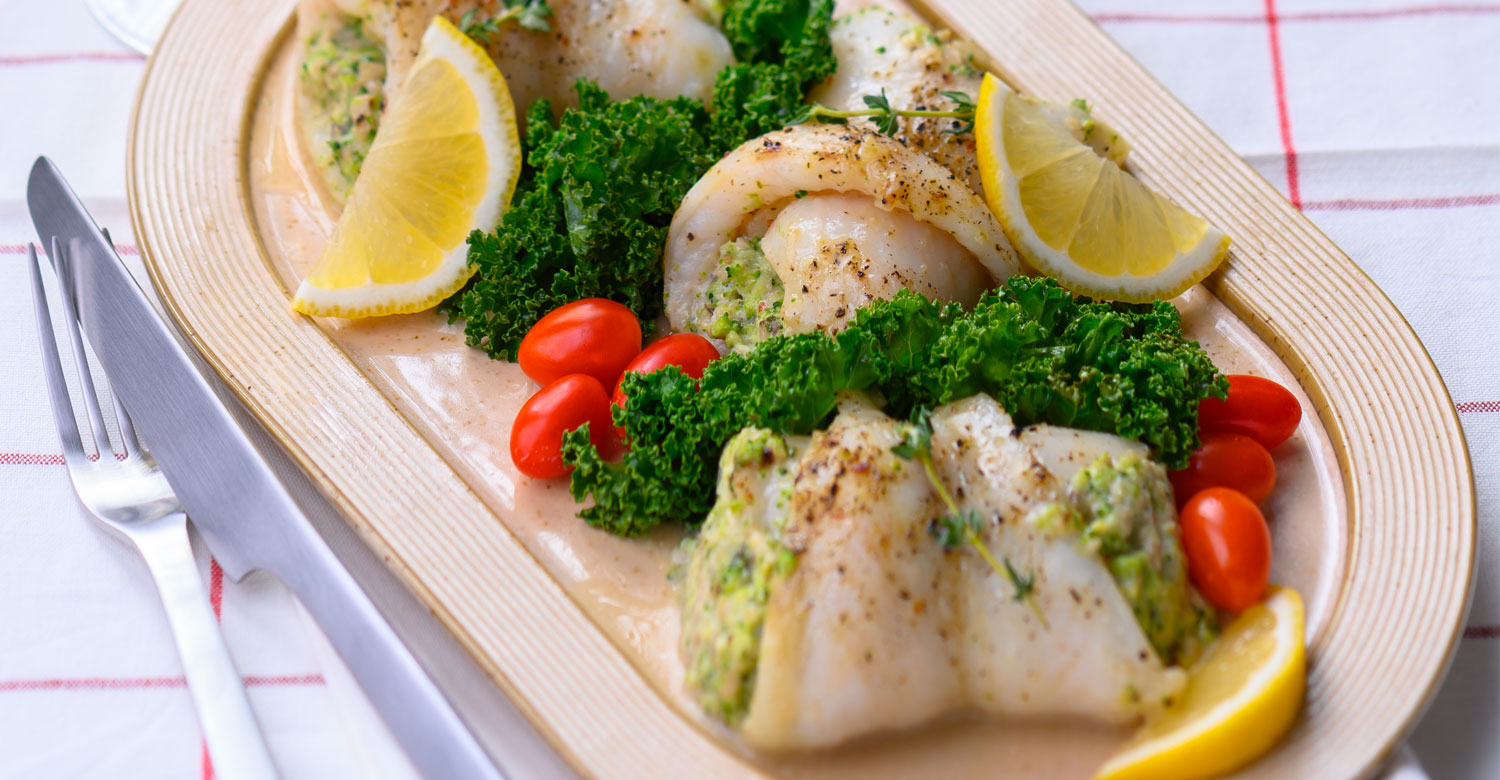 ปลาดอรีม้วนสอดไส้บรอกโคลีและครีมชีส