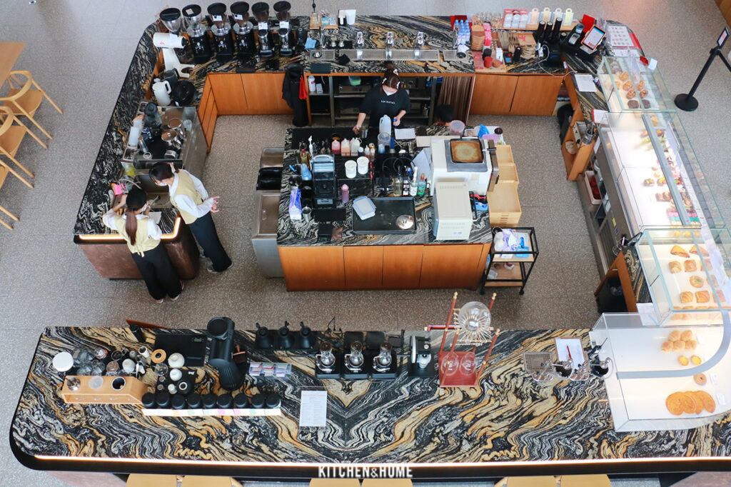 ตรงกลางร้านคือเคาน์เตอร์บาร์ที่เปรียบเสมือนหัวใจของคาเฟ่ ทั้งโซน Slow Bar สำหรับคนที่อยากละเมียดละไมกับกาแฟแก้วโปรด และ Speed Bar สำหรับวันที่รีบแต่ยังอยากได้กาเฟอีนเติมพลัง