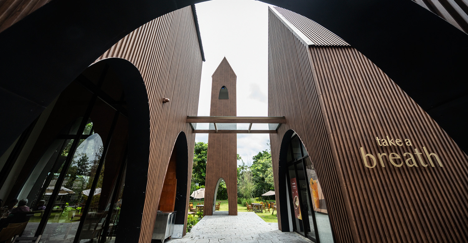 ทางร้านออกแบบตัวอาคารสไตล์นอร์ดิก เน้นบรรยากาศที่ตกแต่งด้วยต้นไม้และสนามหญ้าดูกลมกลืน สบายตา ให้ความรู้สึกโล่ง โปร่งสบาย โดยทำทางเดินหลังคากันแดดกันฝนเชื่อมแต่ละอาคารเพื่อให้สามารถเดินถึงกันได้อย่างสะดวก นอกจากนี้ยังมีกลาสเฮาส์ 2 หลัง สำหรับกลุ่มลูกค้าที่ต้องการความเป็นส่วนตัว หรือจะใช้เป็นพื้นที่จัดงานเลี้ยงเล็กๆ ประชุมงานในบรรยากาศที่ไม่เหมือนใคร ไฮไลต์อีกอย่างหนึ่งของคาเฟ่แห่งนี้คือการดีไซน์โครงสร้างหอระฆังทรงสูงเด่นท่ามกลางพื้นที่สวนเปิดโล่ง