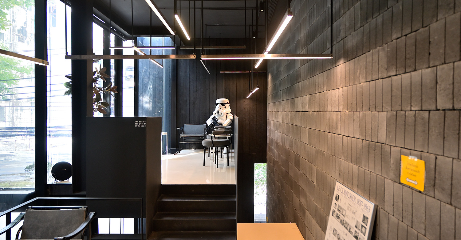 ผมออกแบบออฟฟิศและคาเฟ่แยกกันเป็น 2 ส่วน ด้านหน้าในส่วนของคาเฟ่เป็นทรงสี่เหลี่ยมเรียบง่าย ใช้วัสดุเหล็ก กระจก และไม้ยาคิสุกิ (Yakisugi) หรือไม้เชาสุกิบัน (Shou Sugi Ban) เป็นไม้ซีดาร์จากญี่ปุ่นซึ่งเป็นภูมิปัญญาโบราณที่เขาคิดหาวิธีไม่ให้ไฟลามหากเกิดไฟไหม้ด้วยการนำไม้ไปเบิร์น สีที่เห็นเกิดจากการไหม้ไม่ใช่สีเพนต์ เพราะเราชอบความสวยงามที่เกิดจากฟังก์ชันการแก้ปัญหาที่มีเหตุมีผลเหมือนวิธีการทำงานของบริษัทเรา ส่วนผนังด้านหน้าเราออกแบบโดยใช้กระจกที่สามารถเปิดปิดได้ทั้งบาน เหมือนเป็นการเชื่อมความต่อเนื่องระหว่างพื้นที่ภายในและภายนอกซึ่งเป็นพื้นที่สีเขียวเข้าด้วยกัน