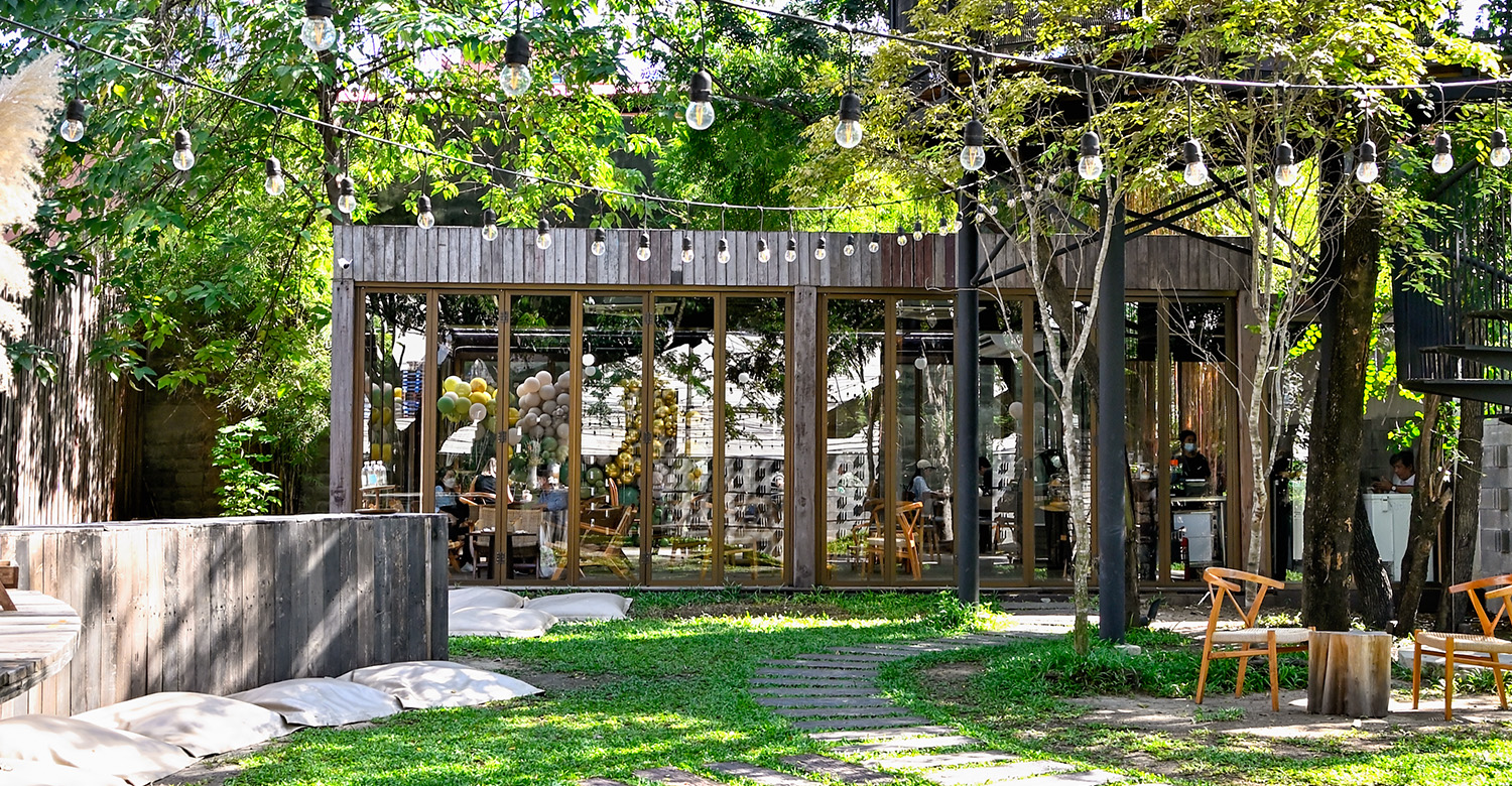 ท่ามกลางความวุ่นวายบนถนนในซอยอ่อนนุช (สุขุมวิท 52) เมื่อเดินผ่านกำแพงอิฐสีเทาเข้ามาจะเหมือนเป็นอีกโลกหนึ่งที่เงียบสงบ มีพื้นที่สีเขียวที่โอบล้อมด้วยต้นไม้และความเป็นธรรมชาติ ตั้งแต่สนามหญ้าที่ทอดตัวไปสู่ตัวร้าน จามจุรีต้นใหญ่ที่แผ่กิ่งก้าน ตลอดจนต้นไม้ใหญ่อีกหลายต้นที่คอยให้ร่มเงา โดยรอบบริเวณคาเฟ่เป็นพื้นที่ให้นั่งเล่น เดินถ่ายรูปได้ทุกมุม และทุกอย่างยังใช้ไม้มาเป็นองค์ประกอบหลักในงานดีไซน์ด้วย
