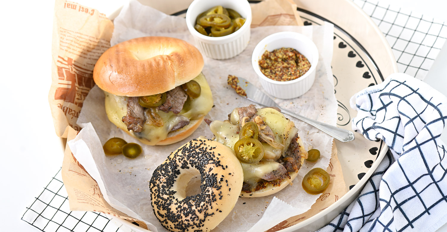 แซนด์วิชเนื้อ ราดชีส เมนูเนื้อทำง่ายสำหรับคนรักเนื้อ ได้ความอร่อยจากเนื้อวัวสันนอกเต็มๆคำ กินกับขนมปังเบเกิลอุ่นร้อน และ พริกดอง