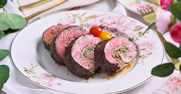3.ใช้ค้อนทุบเนื้อทุบให้เนื้อแผ่ออกเป็นแผ่นบาง โรยด้วยเกลือและพริกไทยให้ทั่ว วางเบคอนบนเนื้อให้เต็มแผ่น ตามด้วยเพสโต เกลี่ยให้ทั่ว ม้วนเนื้อเป็นแท่งกลมมัดด้วยเชือกให้แน่น