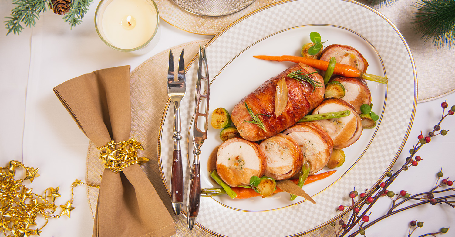 7จัดเสิร์ฟโรลไก่ย่างกับซอสไวน์แดงเคียงกับผักย่าง