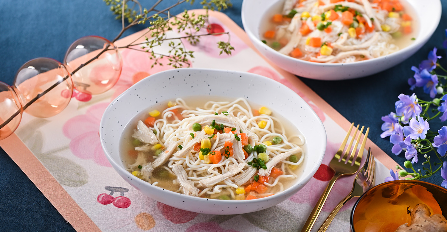 3.ลวกเส้นก๋วยเตี๋ยวในน้ำเดือดใส่ในจาน ตักน้ำซุปไก่ราด โรยต้นหอมซอย จัดเสิร์ฟ