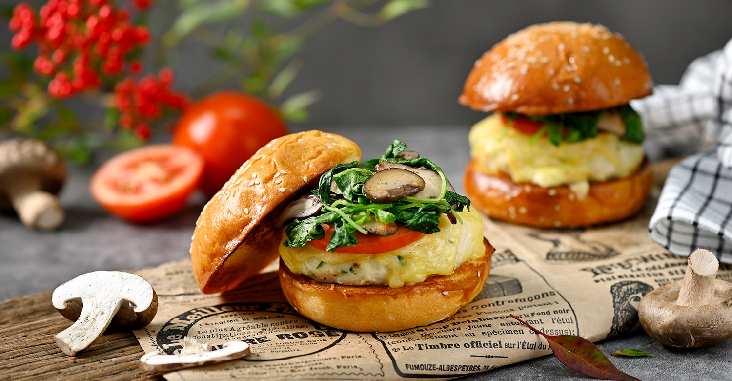 5.เทน้ำมันลงในกระทะเล็กน้อย ใส่ผักโขมและเห็ดลงไปผัด ปรุงรสด้วยเกลือ พริกไทย และ Italian Seasoning เสิร์ฟโดยปิ้งขนมปังวางเบอร์เกอร์ไก่ มะเขือเทศหั่นตามขวาง และผักโขมผัดลงไป จัดเสิร์ฟร้อนๆ