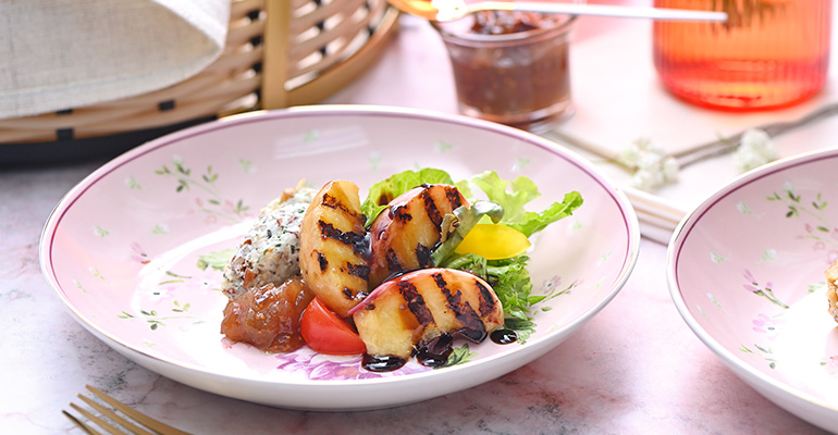สลัดผักสดที่เสิร์ฟคู่กับพีชย่างและชีสนมแพะ
