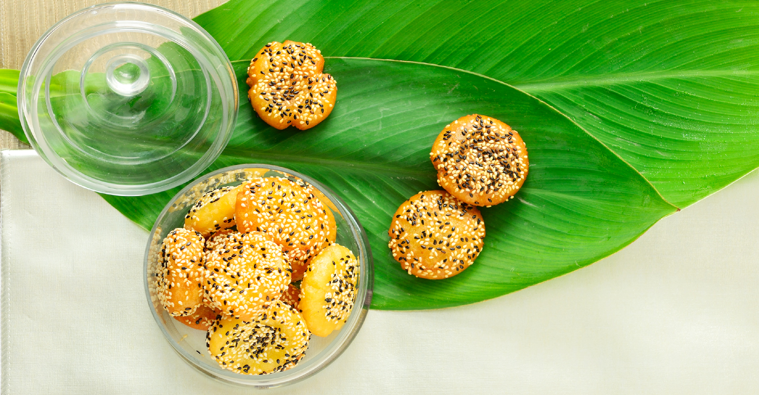 3. ตั้งน้ำมันให้ร้อนใช้ความร้อนปานกลาง ปั้นแป้งเป็นทรงกลมแล้วกดให้แบนนำไปคลุกกับงาให้ติดทั่วแป้ง จากนั้นนำไปทอดจนสุก วางพักให้สะเด็ดน้ำมัน