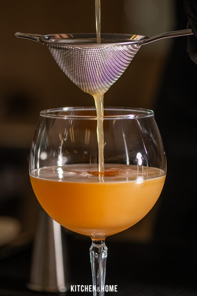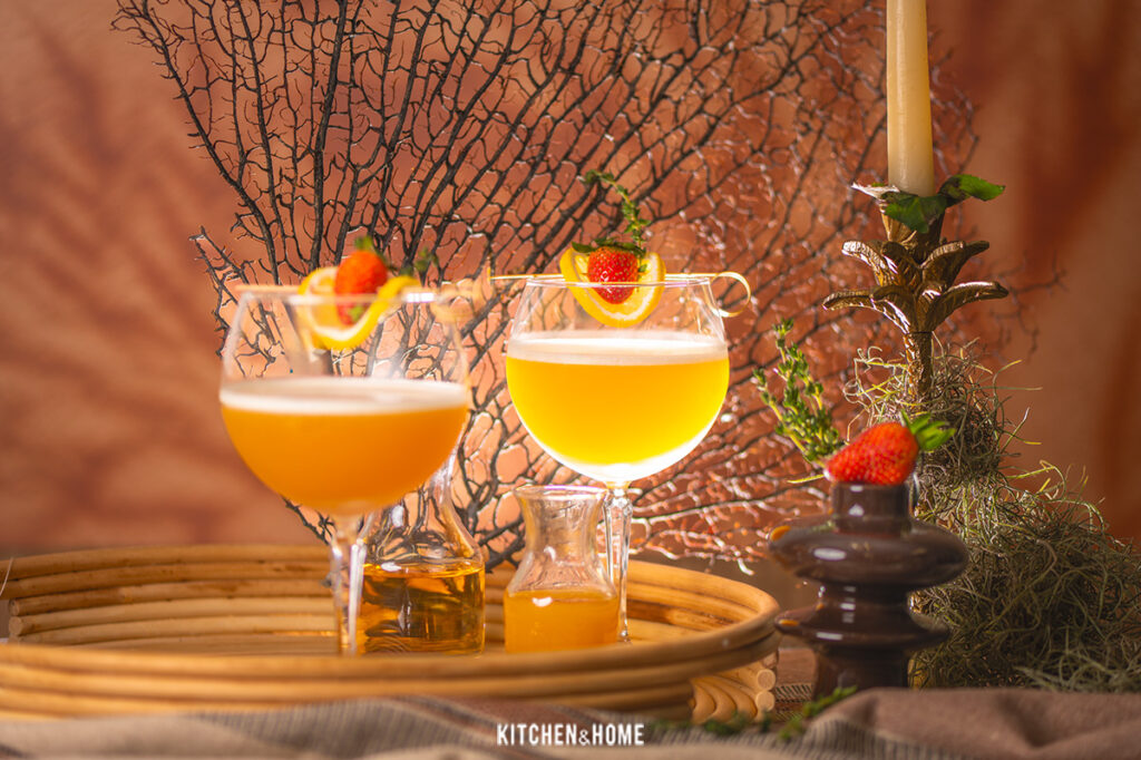 3.รินเครื่องดื่มลงในแก้วผ่านกระชอนตาถี่ ตกแต่งด้วยสตรอว์เบอร์รีและใบไทม์