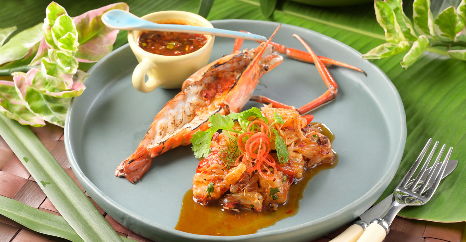 6. จัดจานโดยตักพล่าราดลงบนตัวกุ้ง หรือวางข้างกุ้งย่าง โรยหอมแดงเจียว ใบมะกรูดซอย และใบสะระแหน่