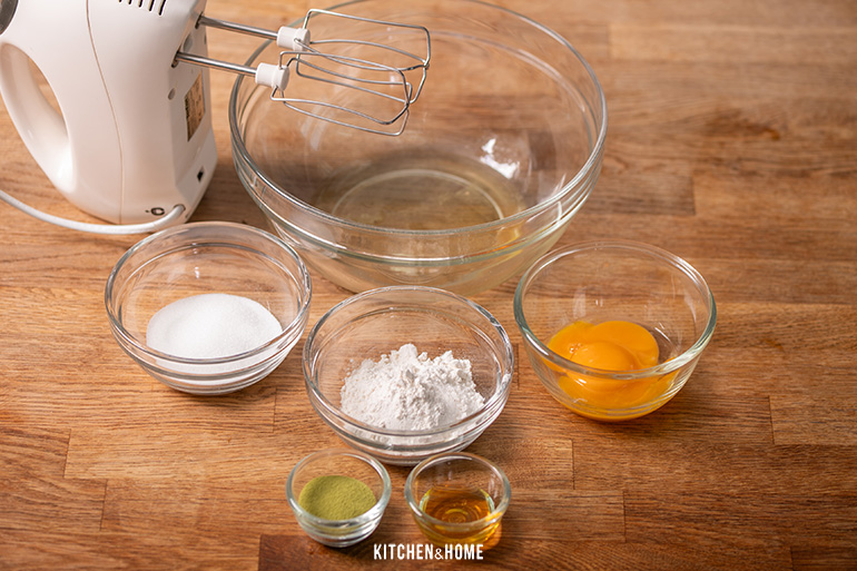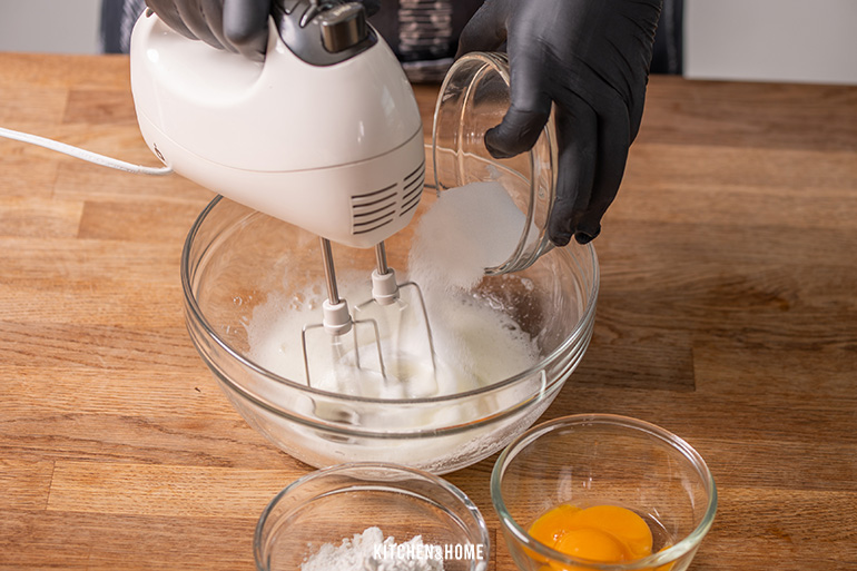 2.แยกไข่ขาว ไข่แดงออกจากกัน  เทไข่ขาวลงในชามผสม ตีไข่ขาวด้วยหัวตีตะกร้อจนเริ่มขึ้นฟอง ค่อนเทน้ำตาลทรายลงไปทีละน้อย ระหว่างนั้นเดินเครื่องไปเรื่อยจนน้ำตาลทรายหมด