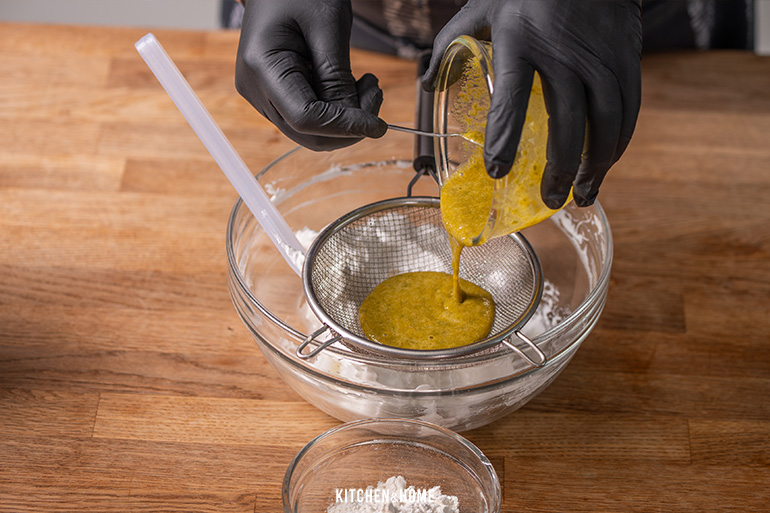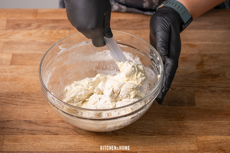 5.ร่อนแป้งขนมปัง 2 ครั้งแล้วนำไปผสมกับส่วนผสมไข่ ตะล่อมเบาด้วยพายยางจนเข้ากัน