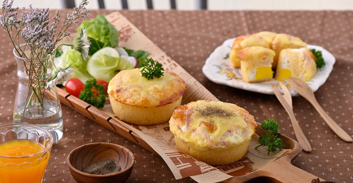 4.ตอกไข่ไก่ใส่ลงไปตรงกลางฟองละ 1 พิมพ์ แล้วโรยรอบๆด้วยแฮมหั่นและ ชีส นำไปอบประมาณ 25 -30 นาที
