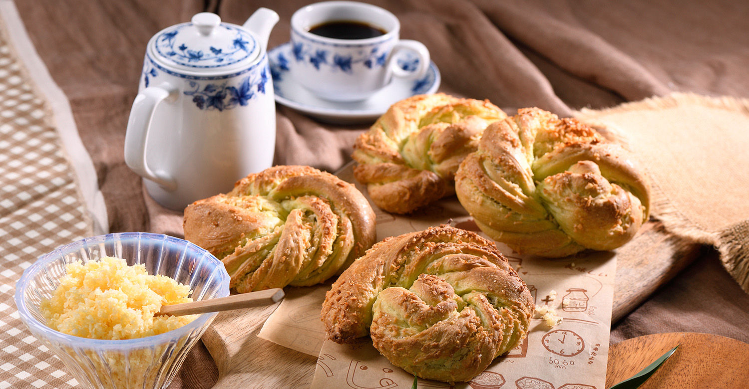 6.บิดแป้งเป็นเกลียวแล้วม้วนเป็นก้อนกลมวางในถาดอบ พักแป้งไว้ประมาณ 30 นาทีหรือจนแป้งขึ้นฟู นำเข้าเตาอบที่อุณหภูมิ 170-180 องศาเซลเซียส เวลา 15-20 นาที หรือจนสุก