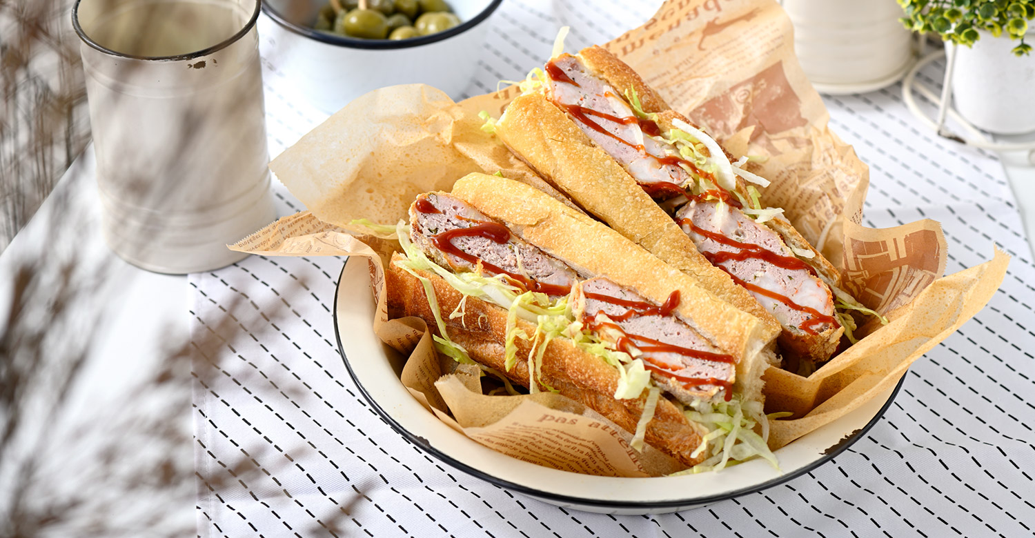 แซนด์วิชหมูก้อนสอดไส้กุ้ง ราดด้วยซอสบาร์บีคิวทำเอง อร่อยโดนใจ