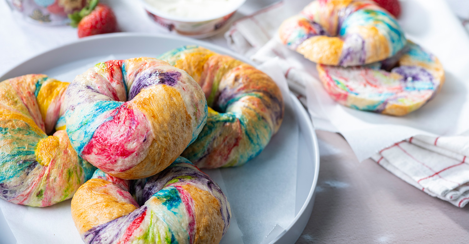 หากอยากให้เบเกิลสีเข้มให้ใช้สีผสมอาหารชนิดเจล แต่หากใช้สีชนิดผงให้ผสมลงไปขณะนวดแป้ง โดยแบ่งแป้งออกเป็น 6 ส่วนตามจำนวนสี