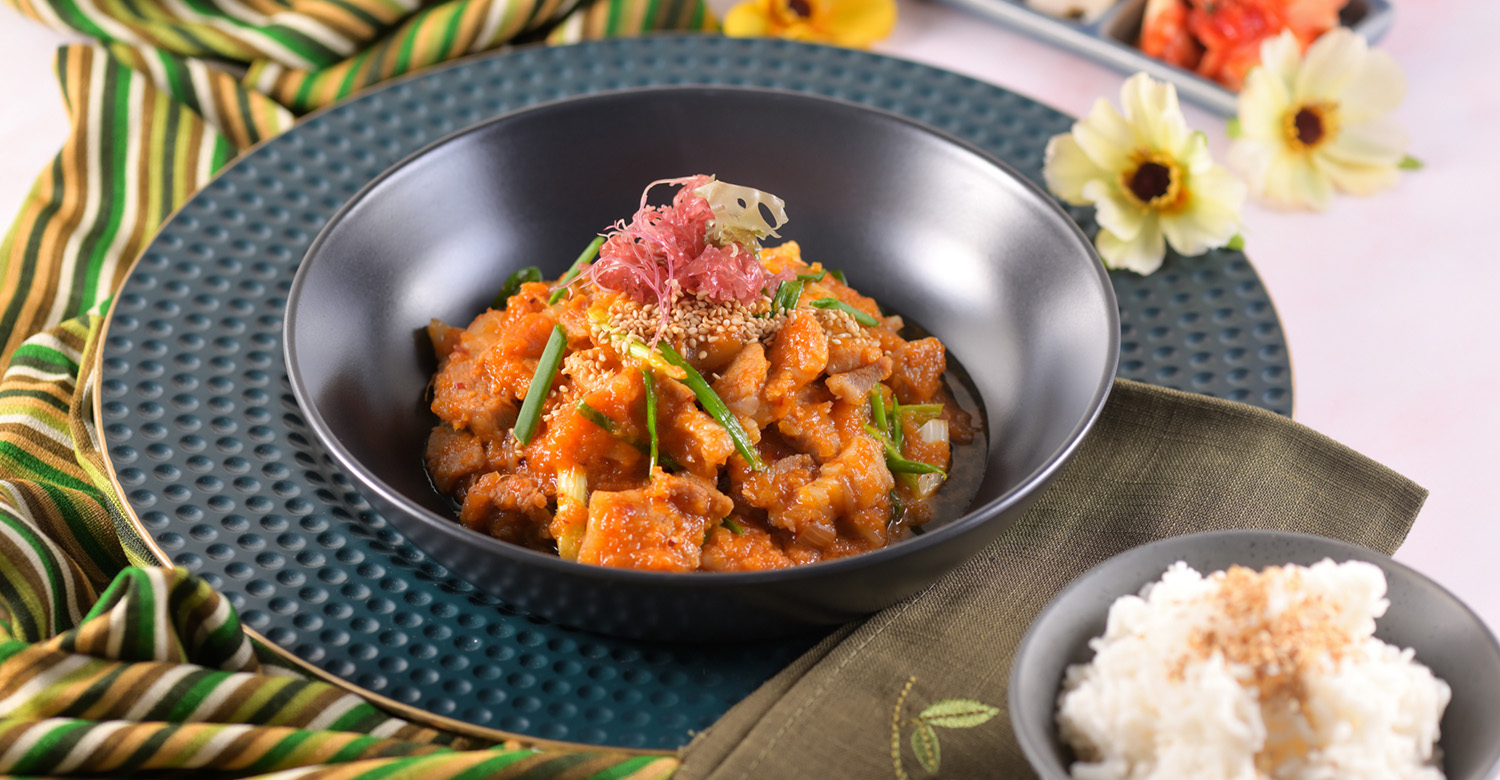 1.ใส่กระเทียม ขิง หอมหัวใหญ่ โคชูจัง ซีอิ๊วขาว น้ำผึ้ง น้ำมันงา มิริน และพริกป่นลงในเครื่องปั่นสับ ปั่นจนส่วนผสมเนียน
