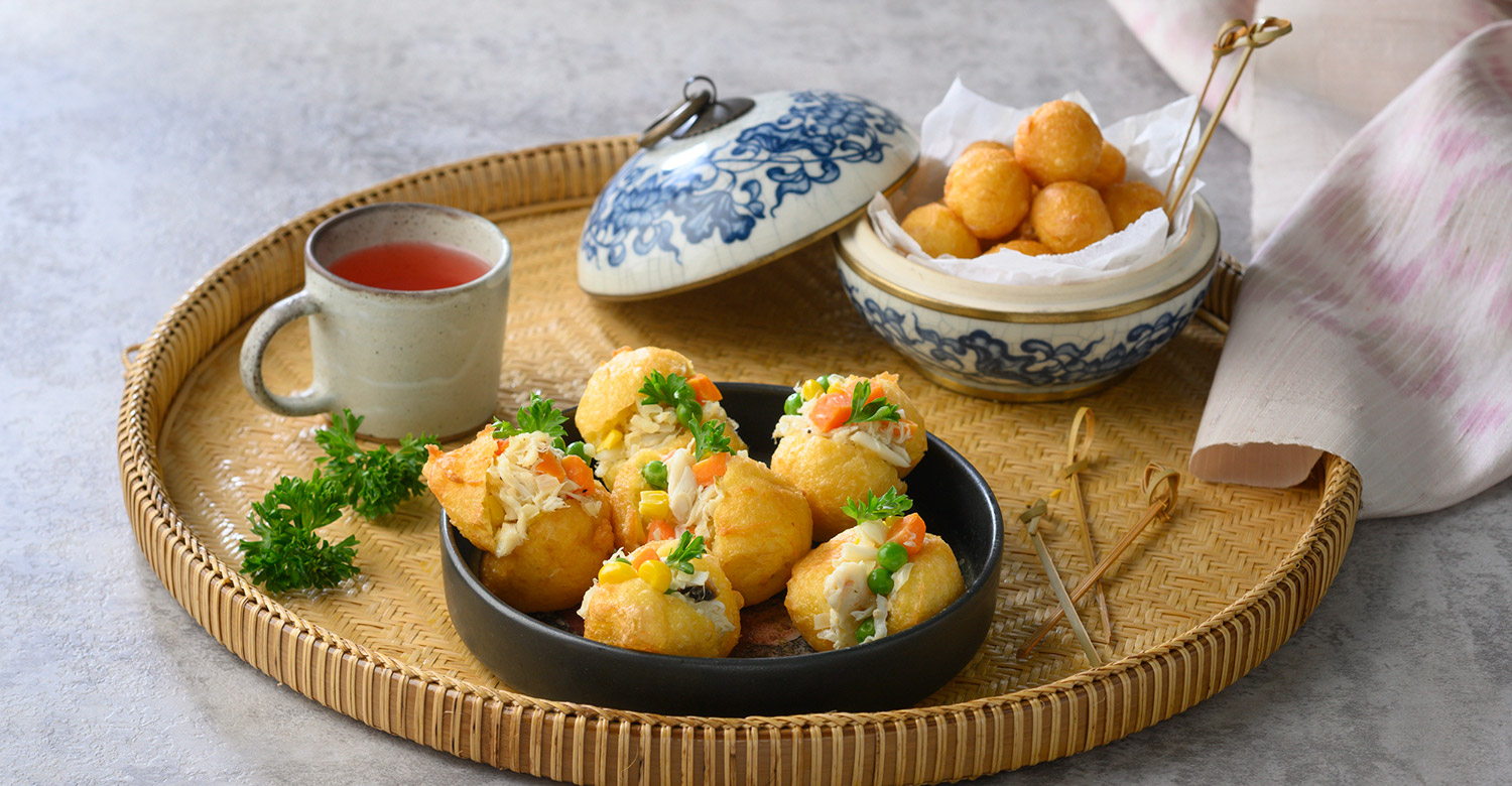 สูตรทองพลุไส้ปู เมนูของว่างทำง่าย ขนมไทยลูกผสมยที่ใช้แป้งแบบเดียวกับเอแคลร์ แต่นำไปทอดแทนการอบ