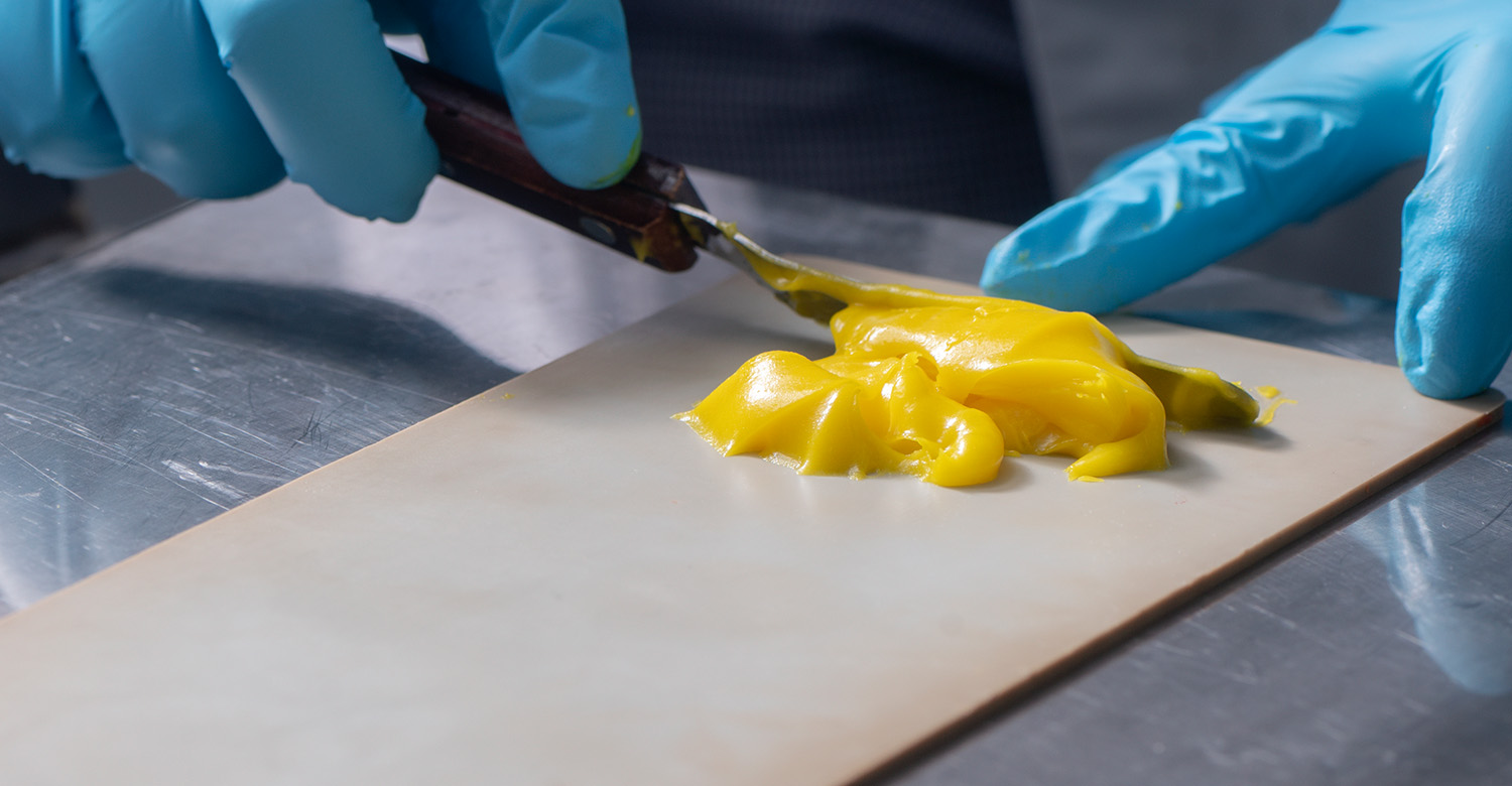 2.ตักส่วนผสมหยอดลงบนแผ่นซิลิโคนหรือกระดาษไข แล้วใช้สปาตูลาปาดให้บาง