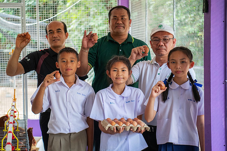 ด้าน นายวราราชย์ เรืองศรี ผู้เชี่ยวชาญอาวุโส ซีพีเอฟ ระบุว่า โรงเรียนที่เข้าร่วมโครงการฯ จะได้รับการสนับสนุนตั้งแต่โรงเรือนไก่ไข่มาตรฐาน แม่พันธุ์ และอาหารสัตว์ในรุ่นแรกฟรี พร้อมองค์ความรู้จากผู้เชี่ยวชาญ เพื่อให้โรงเรียนสามารถดูแลระบบได้ด้วยตนเองในระยะยาว สามารถผลิตไข่ไก่สดที่มีคุณภาพ เข้าโครงการอาหารกลางวันนักเรียนได้รับประทานไข่ไก่อย่างเพียงพอและสม่ำเสมอ ผลผลิตส่วนที่เหลือจากการบริโภค นำไปจำหน่ายให้กับผู้ปกครองและชุมชน มีรายได้เข้ากองทุนโครงการฯ