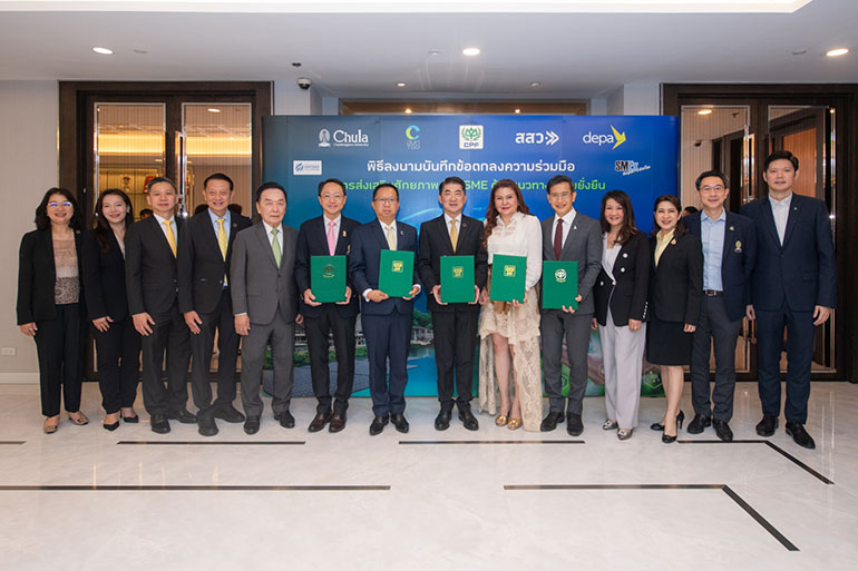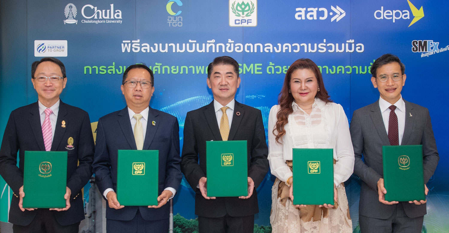 บริษัท เจริญโภคภัณฑ์อาหาร จำกัด (มหาชน) หรือ ซีพีเอฟ เดินหน้าขับเคลื่อนการเติบโตอย่างยั่งยืนในห่วงโซ่อุปทาน โดยผนึกกำลังกับพันธมิตร 4 หน่วยงานหลัก ได้แก่ คณะวิศวกรรมศาสตร์ จุฬาลงกรณ์มหาวิทยาลัย, องค์การบริหารจัดการก๊าซเรือนกระจก (องค์การมหาชน) หรือ อบก., สำนักงานส่งเสริมวิสาหกิจขนาดกลางและขนาดย่อม (สสว.) และ สำนักงานส่งเสริมเศรษฐกิจดิจิทัล (ดีป้า) ลงนามบันทึกข้อตกลงความร่วมมือ (MOU) เพื่อยกระดับศักยภาพผู้ประกอบการธุรกิจขนาดกลางและขนาดย่อม (SME) คู่ค้าของซีพีเอฟ ให้มีความเข้มแข็งและพร้อมแข่งขันในเศรษฐกิจโลกที่ให้ความสำคัญกับความยั่งยืนมากขึ้น