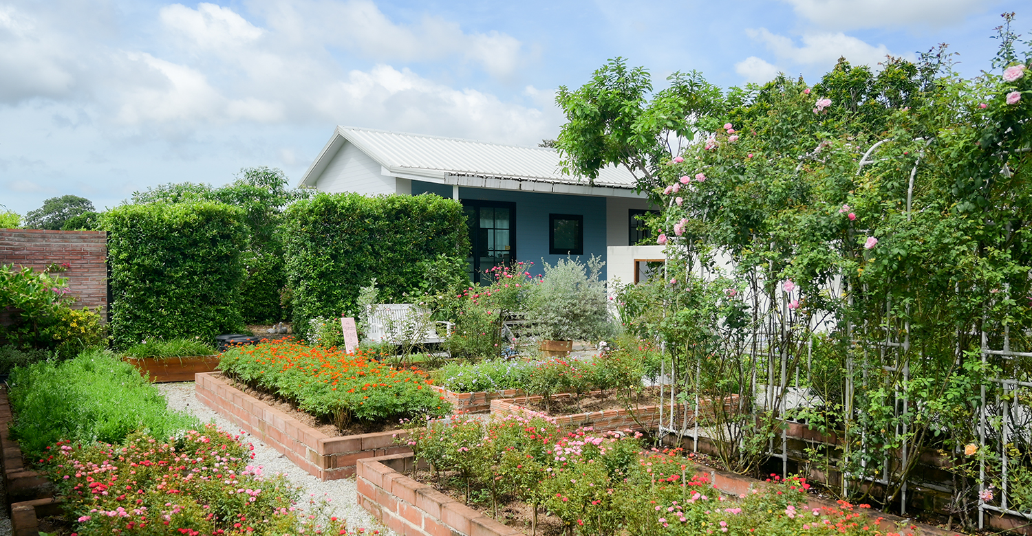 โดยความตั้งใจแรกเพียงแค่อยากปลูกเป็นงานอดิเรก “ตอนแรกไม่ได้คิดว่าจะทำเป็นร้านกุหลาบอะไรเลย แค่ออกแบบเลย์เอาต์ว่าเราจะปลูกกุหลาบยังไง อยากได้เป็นสวนสไตล์อังกฤษ มีโรงเรือน มีบ้านพักหลังเล็กๆ จากนั้นก็ให้คนมาจัดสวนตามไอเดียของเรากับสั่งทำบ้านน็อกดาวน์ พอทำพื้นที่ส่วนแรกเสร็จเรียบร้อยออกมาสวยอย่างที่คิดไว้ ประกอบกับยังมีพื้นที่เหลืออีกเยอะเลยค่อยๆ ทำส่วนอื่นเพิ่มเติม โดยหลักๆ จะมีเรากับแม่เข้ามาดูแล เวลากุหลาบออกดอกสวยงามก็จะมีแค่พวกเราที่ได้เห็น เลยมีความคิดว่าอยากเปิดให้คนอื่นได้เข้ามาชมความสวยงามของกุหลาบอย่างที่เราได้เห็นบ้าง”
