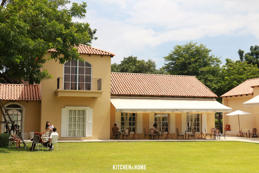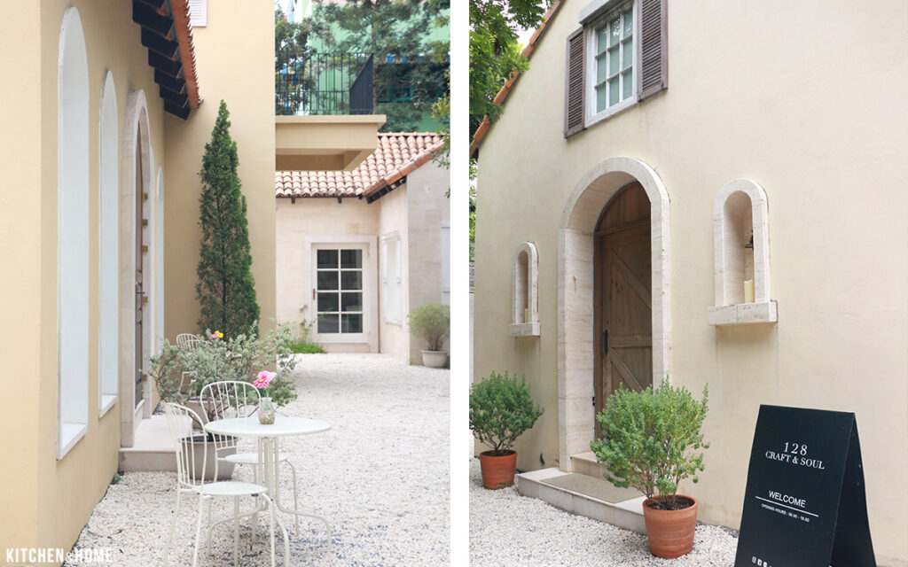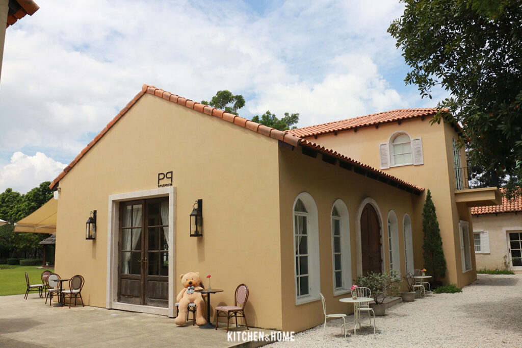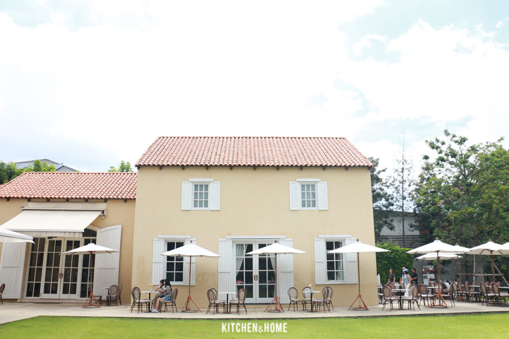 ทันทีที่ก้าวเข้ามา สิ่งแรกที่จะสัมผัสได้คือบรรยากาศเหมือนหมู่บ้านเล็กๆ แถบฝรั่งเศส อาคารสไตล์ยุโรปสีเอิร์ธโทน หลังคาทรงจั่วสูง ดีไซน์เรียบง่ายรายล้อมด้วยหน้าต่างกระจกบานใหญ่ที่เปิดรับแสงธรรมชาติ ทำให้ภายในร้านสว่างและโปร่งโล่ง ทุกพื้นที่ในร้านถูกออกแบบให้เชื่อมโยงกับธรรมชาติ มีสวนเล็กๆ ที่จัดไว้อย่างอบอุ่น พร้อมโต๊ะกลางแจ้งสำหรับคนที่ชอบนั่งท่ามกลางธรรมชาติและต้นไม้สีเขียว