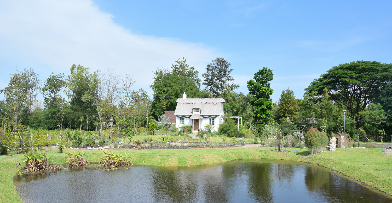 “เราเน้นการใช้ชีวิตเอาต์ดอร์ในสวนดอกไม้ ภูมิสถาปัตย์รอบบ้านจึงถูกออกแบบในแนวที่ทุกคนในบ้านชื่นชอบ คือเป็นสวนอังกฤษผสมกับสวนฝรั่งเศสที่กลมกลืนกันด้วยพรรณไม้ที่สอดรับกับสไตล์ของบ้าน อาทิ ต้นสนนานาชนิด, ซิลเวอร์โอ๊ก, แอปเปิล, อะโวคาโด, Tea Tree, มะเดื่อฝรั่ง (Fig), ฝรั่งสีชมพู, ลำไยคริสตัส และไม้ดอกไม้ประดับยืนต้นหรือไม้ดอกข้ามปี เช่น ประดู่แดง, คนทีสอ, American Beauty, ตรีชวา, ชงโคไทย, Silver Button, พุดตานญี่ปุ่น, กุหลาบ, Mexican Sage, ไอริสสีต่างๆ, Blue Sage, เดซีเลื้อย, Russian Sage, หอมหมื่นลี้, คูณม่วง ฯลฯ และที่สำคัญคือ The Potager หรือ Kitchen Garden ในแนวฝรั่งเศสที่ปลูกไม้สวนครัว อาทิ โรสแมรี่ สเปียร์มินต์ มะนาว ตะไคร้ ดอกไม้รับ’ทานได้ ชาสมุนไพรกลิ่นหอมจากโรสแมรี่และสเปียร์มินต์ให้กลิ่นสัมผัสที่สดชื่นกับผู้มาเยือน
