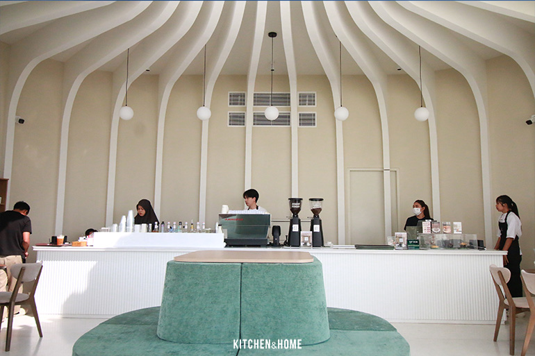 เมื่อก้าวเข้าสู่ Curvy Dining ทางเดินโค้งที่ทอดยาวราวกลีบดอกไม้จะนำพาคุณเข้าสู่โลกที่ภายในและภายนอกหลอมรวมเป็นหนึ่ง ซุ้มโค้งที่ออกแบบอย่างประณีตทำหน้าที่เป็นทั้งโครงสร้างและศิลปะ แบ่งพื้นที่อย่างชาญฉลาดสำหรับการนั่งเล่น พักผ่อน หรือถ่ายภาพที่ต้องใจสายโซเชียล ช่องแสงด้านบนปล่อยให้ แสงแดดอ่อนโยนไหลผ่าน สร้างเงาพลิ้วไหวที่เคลื่อนไหวราวการเต้นรำของกลีบดอกไม้ ลมธรรมชาติที่พัดผ่านยิ่งเพิ่มความรู้สึกอิสระ ทำให้ทุกย่างก้าวในคาเฟ่เปี่ยมด้วยชีวิตชีวา