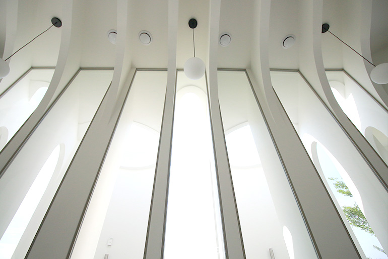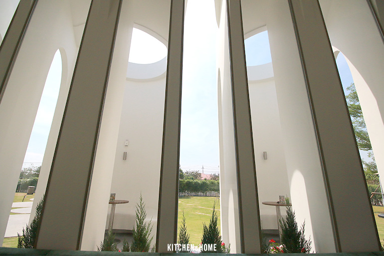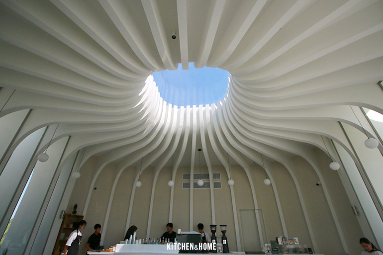ภายใน Curvy Dining เพดานสูง 6 เมตร และกระจกใสรอบทิศเปิดรับวิวสนามหญ้าภายนอกอย่างเต็มตา สร้างความรู้สึกเหมือนนั่งอยู่ในสวนส่วนตัวที่เงียบสงบ สกายไลท์บนเพดานกระจายแสงนุ่มนวล เสริมมิติให้พื้นที่กว้างขวางยิ่งขึ้น เส้นโค้งภายในถูกจัดวางอย่างไหลลื่น เชื่อมโยงทุกมุมของคาเฟ่ราวกับกลีบดอกไม้ที่ทับซ้อนกันอย่างเป็นธรรมชาติ ทุกองค์ประกอบถูกออกแบบเพื่อให้ผู้มาเยือนดื่มด่ำกับความงามของธรรมชาติในทุกมุมมอง