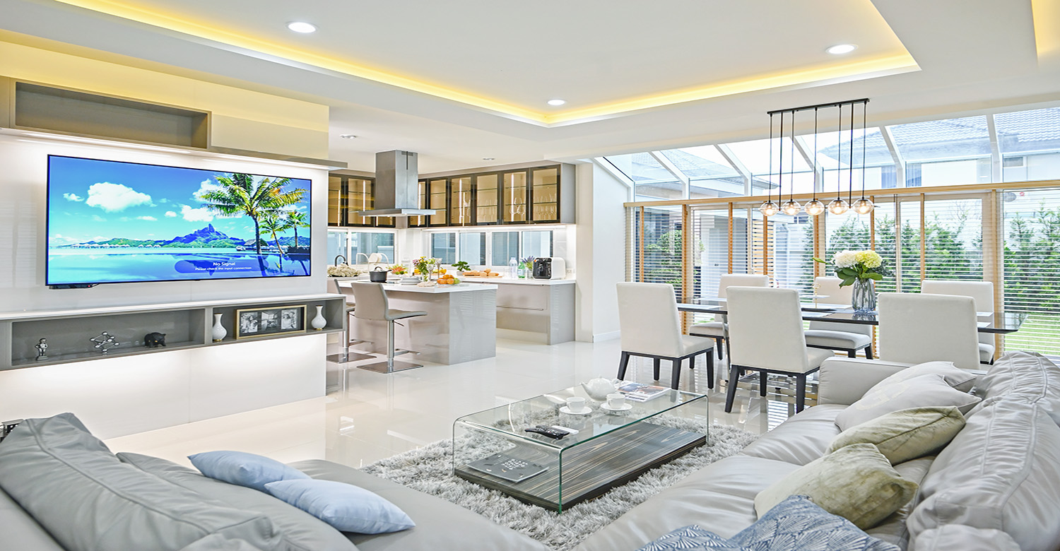 จุดเด่นของแบบบ้านสไตล์นี้เน้นกระจกค่อนข้างเยอะ ซึ่งข้อดีของการใช้กระจกนั้นนอกจากเปิดมุมมองให้ผู้อาศัยมองเห็นพื้นที่สีเขียวรอบบ้าน ยังทำให้บ้านดูโปร่งโล่งและน่าอยู่มากยิ่งขึ้น คุณเปิ้ลเล่าว่า แบบบ้านตัวอย่างมีการแบ่งกั้นห้องตั้งแต่ห้องนั่งเล่น ห้องทานข้าว และห้องครัว แต่เธอกลับรู้สึกชอบบ้านแบบโล่งๆ มากกว่า