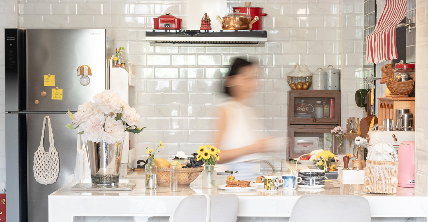 “เคาน์เตอร์ครัวเลือกเป็นหินอ่อนก็เพราะมีอยู่ช่วงหนึ่งที่ไปประชุมงานกับเพื่อนที่ร้าน Dean & Deluca ที่ตึกมหานครซึ่งวัสดุเป็นหินอ่อน เราไปทุกศุกร์รู้สึกว่ามันสวย แล้วช่วงนั้นกำลังสร้างบ้านพอดีเราก็อยากจะมีเจ้าสิ่งนี้มาไว้ในบ้านก็ทำให้เรานึกถึงความทรงจำในตอนนั้น