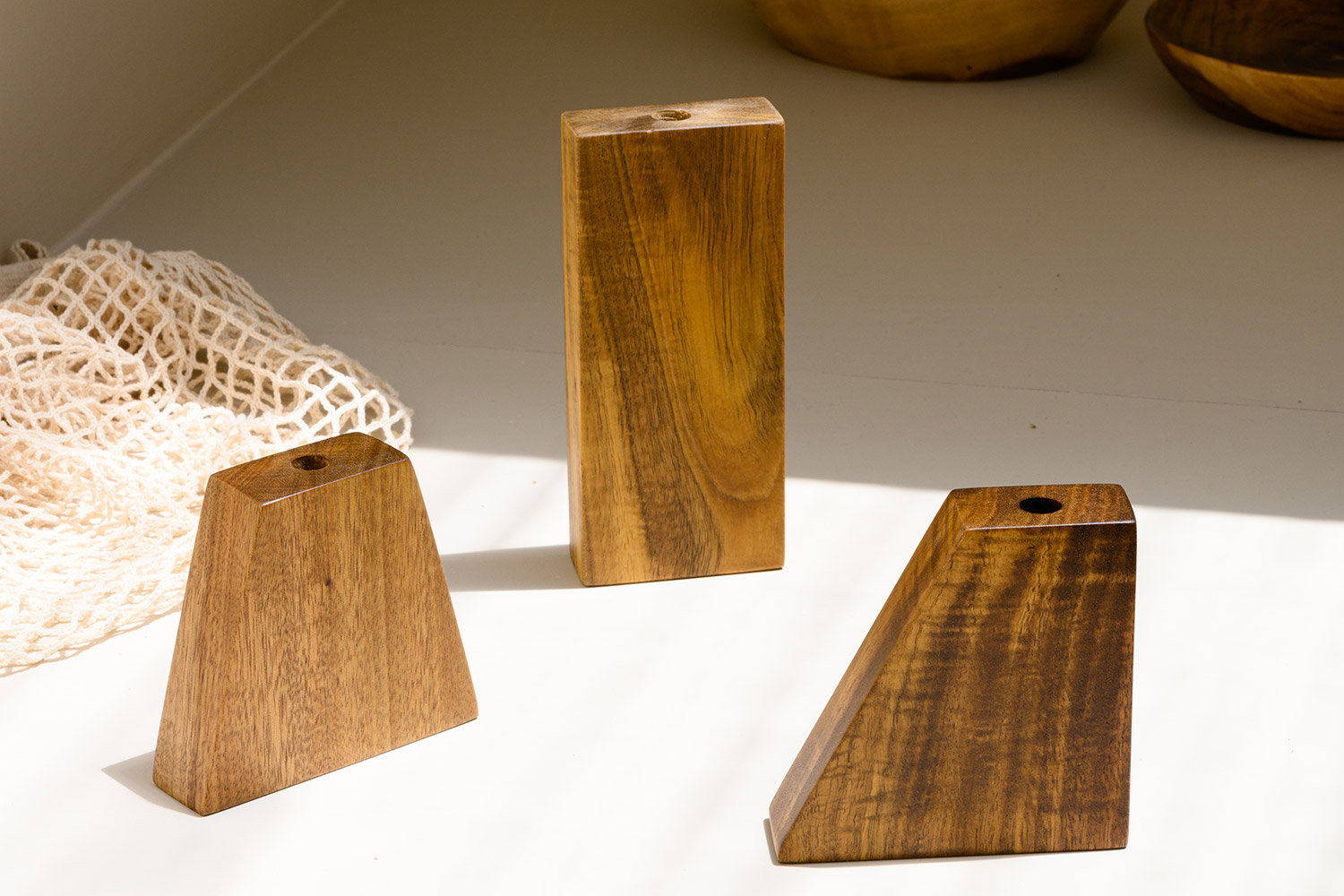 “พี่สาวคนโตของเราเป็นคนเริ่มต้นมาให้เป็นชื่อแบรนด์ ซึ่งบัวไม่ได้มีความรู้เรื่องเกษตรอะไรเหมือนพี่เพิ่ม แต่บัวรู้เรื่องการทำอีคอมเมิร์ซ (E-Commerce) ทำให้เราพอมองเห็นโอกาสในการเจาะตลาดออนไลน์ เราเริ่มจากมุมมองของการเป็นกลุ่มลูกค้าที่มองหาเฟอร์นิเจอร์สไตล์มินิมอล แต่ภาพจำของงานไม้ไทยมักจะดูมีอายุและเข้าถึงยาก เราจึงคุยกันกับพี่ๆ เพื่อเพิ่มคุณค่าให้กับไม้ป่าคุณพ่ออย่างจริงจังด้วยการรีแบรนด์เพื่อให้เข้าถึงกลุ่มลูกค้าวัยรุ่นมากขึ้น เราเพิ่งมาเริ่มเรียนรู้การผลิตเฟอร์นิเจอร์ไม้ตั้งแต่ต้น ลองผิดลองถูกจากชิ้นเล็กอย่างแจกัน เลือกรูปแบบเป็นทรงเรขาคณิตเรียบง่าย ปรึกษากับพี่เพิ่มถึงความเป็นไปได้ว่าใช้ไม้ในสวนได้หรือไม่ มีความหลากหลายของสีไม้อย่างไรบ้าง ไม้แต่ละชิ้นแข็งแรงเพียงพอกับฟังก์ชันการใช้งานมากน้อยเท่าไหร่” คุณบัวเท้าความถึงความตั้งใจของสามพี่น้องเพื่อสานต่อมรดกสวนป่าของคุณพ่อ