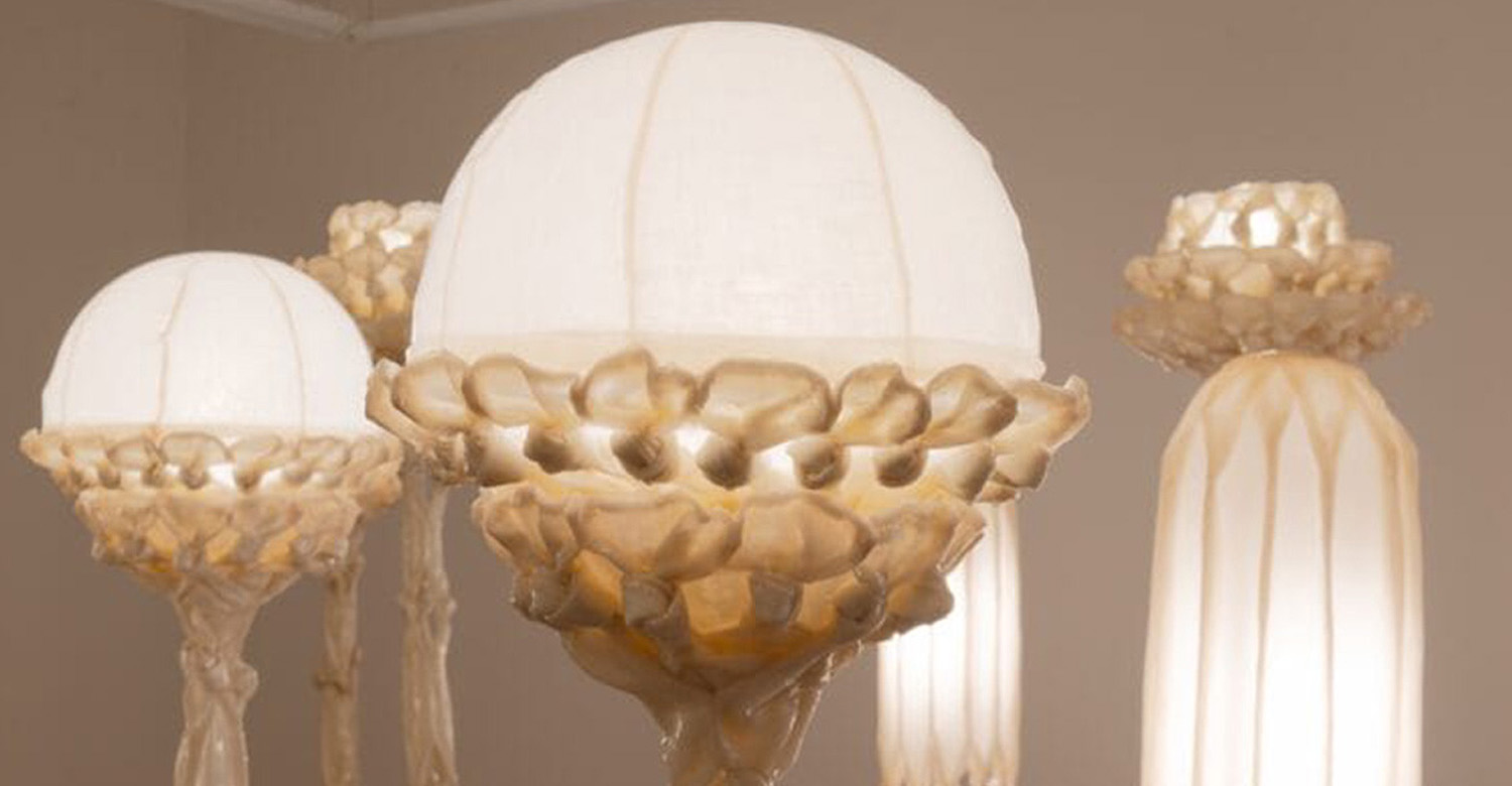 จุดร่วมกันในโคมไฟคือการเย็บผ้าใยกัญชงขึ้นมาเป็นไส้ไก่ที่มีขนาดหน้ากว้างประมาณ 2 นิ้ว แล้วใช้การผูกปมโบตามจังหวะของแต่ละชิ้น ก่อนชุบเรซินให้เกิดการแปรสภาพเป็นของแข็ง ผลงานชุดที่เปิดตัวไปใน Volume Gallery , Los Angeles นี้เป็นการปรับมาใช้เรซินชีวภาพรวมกับเรซินสังเคราะห์เป็นครั้งแรก ซึ่งทั้ง 2 ชนิดแตกต่างกันคือเรซินสังเคราะห์จะแห้งไวและให้ความแข็งแรงมากกว่า แต่เมื่อแห้งแล้วความโปร่งแสงของเนื้อผ้าก็จะหายไป ทั้งยังมีผลให้การพับจีบหรือวางทบกันของผ้าแต่ละชิ้นไม่เกิดมิติ ในขณะที่เรซินชีวภาพสามารถปรับแต่ง จับและการวางทบ รวมถึงการขยับผิวให้มีอากาศเข้าไปอยู่ด้านในเพื่อให้เกิดมิติของการทับทบและรวมติดกันของชิ้นผ้าไส้ไก่ใยกัญชงแต่ละชิ้นได้มากกว่า