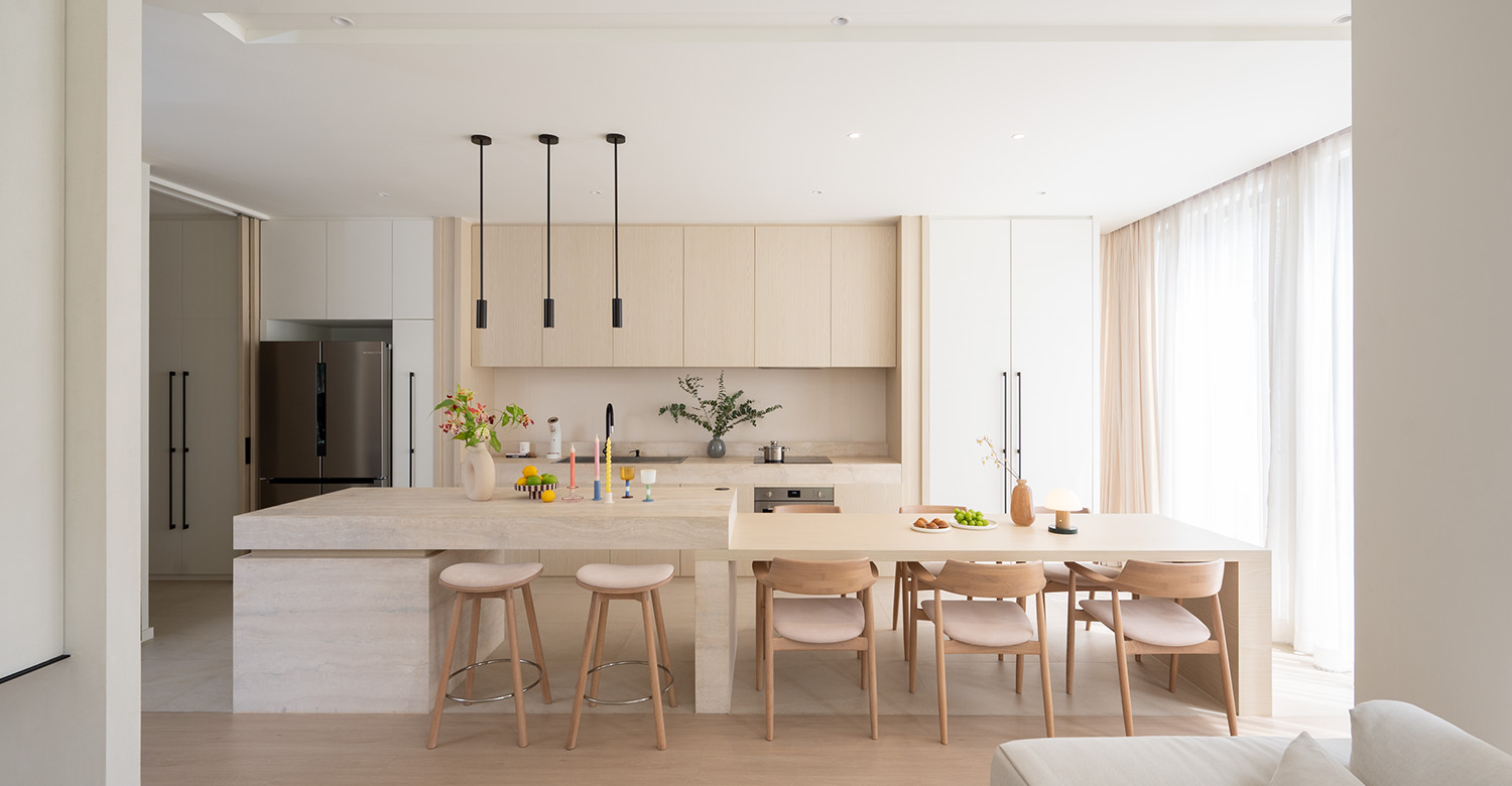 บริเวณชั้นล่างเมื่อได้รับการรีโนเวตพื้นที่ใช้สอยใหม่เราจะพบกับสเปซกว้างๆ เปลี่ยนจากรูปแบบครัวปิดกลายเป็นห้องครัวที่เชื่อมต่อกับห้องนั่งเล่น เกิดเป็น Open Space ที่ถูกออกแบบให้เป็นครัวดีไซน์สวยรองรับการทำอาหารหนักได้ด้วย รวมถึงเพิ่มพื้นที่ใช้งานอเนกประสงค์ โดยทำไอส์แลนด์ขนาดใหญ่เชื่อมต่อไปเป็นโต๊ะรับประทานอาหารด้วยการกำหนดขอบเขตการใช้งาน โดยกำหนดระดับความสูงให้ต่างกัน เพื่อแยกฟังก์ชันใช้งานให้เกิดความชัดเจน