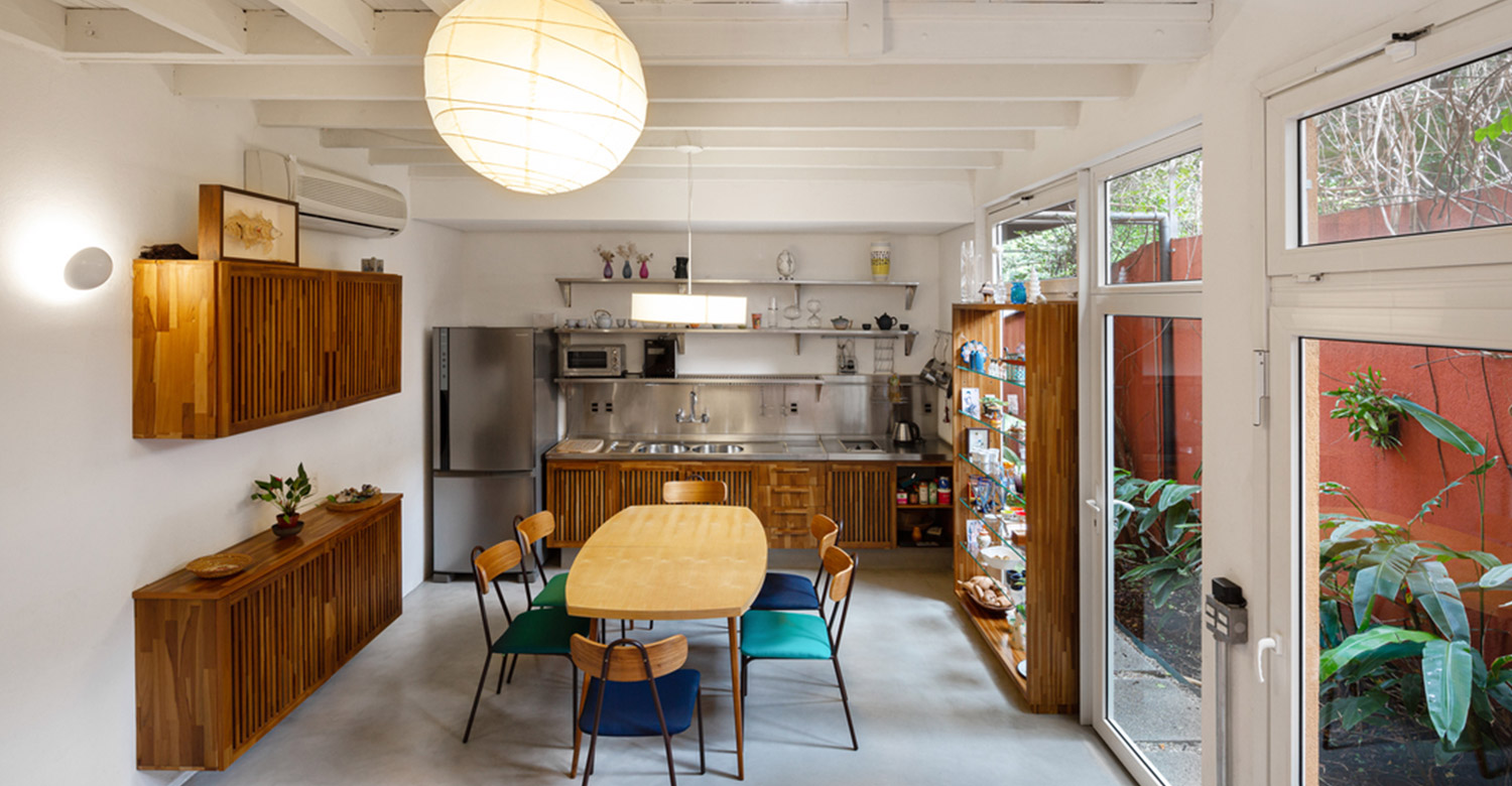 เดิมที่ก่อนการรีโนเวท ส่วนครัวถูกจัดวางไว้ส่วนชั้น 2 ของบ้าน เมื่อมีการรีโนเวท จึงมีการปรับแปลงให้ดูมีชีวิตชีวาและปลอดโปร่งมากขึ้นด้วยการย้ายลงมาส่วนชั้นล่างของบ้าน มองเห็นมุมสวนแนวยาว ช่วยทั้งเรื่องการระบายอากาศ ทั้งยังดูสดชื่นสวยงาม และจัดวางแปลนครัวให้อยู่ชิดผนัง เพื่อประหยัดพื้นที่
